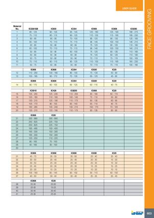 FACE GROOVING USER GUIDE Material No. IC228/528 IC830 IC354 IC908 IC808 IC8250 1 85 - 125 90 - 135 95 - 145 120 - 180 125 - 190 180 - 270 2 75 - 110 80 - 115 90 - 125 110 - 155 115 - 165 165 - 230 3 60 - 85 65 - 95 70 - 100 85 - 125 90 - 130 125 - 185 4 65 - 100 70 - 110 75 - 115 95 - 145 100 - 150 140 - 215 5 50 - 85 55 - 90 60 - 95 75 - 120 80 - 125 110 - 180 6 65 - 100 70 - 110 75 - 115 95 - 145 100 - 150 140 - 215 7 50 - 85 55 - 95 60 - 100 75 - 125 80 - 130 110 - 185 8 50 - 85 55 - 90 60 - 95 75 - 120 80 - 125 110 - 180 9 50 - 75 50 - 80 55 - 90 70 - 110 75 - 115 105 - 165 10 75 - 110 80 - 115 90 - 125 110 - 155 115 - 165 165 - 230 11 50 - 75 50 - 80 55 - 90 70 - 110 75 - 115 105 - 165 IC806 IC808 IC354 IC830 IC20 12 110 - 200 100 - 180 80 - 145 75 - 135 50 - 90 13 100 - 185 90 - 170 70 - 135 65 - 125 45 - 85 IC806 IC808 IC354 IC830 IC20 14 90 - 170 80 - 155 65 - 125 60 - 115 40 - 75 IC5010 IC428 IC8250 IC808 IC20 15 135 - 255 125 - 230 110 - 205 85 - 160 60 - 115 16 120 - 180 110 - 160 100 - 145 75 - 110 55 - 80 17 130 - 215 120 - 195 110 - 175 85 - 135 60 - 95 18 105 - 170 95 - 155 85 - 140 65 - 110 45 - 75 19 160 - 265 145 - 240 130 - 215 100 - 170 70 - 120 20 130 - 215 120 - 195 110 - 175 85 - 135 60 - 95 IC808 IC20 21 330 - 990 300 - 900 22 250 - 825 225 - 750 23 250 - 825 225 - 750 24 165 - 495 150 - 450 25 165 - 330 150 - 300 26 165 - 330 150 - 300 27 120 - 250 110 - 225 28 80 - 165 75 - 150 29 40 - 165 35 - 150 30 IC806 IC908 IC808 IC830 IC20 31 45 - 70 35 - 55 35 - 60 25 - 40 25 - 40 32 30 - 50 25 - 40 25 - 40 20 - 30 15 - 30 33 30 - 50 25 - 40 25 - 40 20 - 30 15 - 30 34 25 - 45 20 - 35 20 - 35 15 - 25 15 - 25 35 20 - 30 15 - 25 15 - 25 10 - 20 10 - 15 36 105 - 180 85 - 145 90 - 150 65 - 110 60 - 100 37 40 - 50 30 - 40 30 - 40 25 - 35 35 - 45 IC808 IC20 38 25-30 20-30 39 20-30 15-25 40 30-45 30-40 41 25-30 25-30 603
