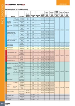 FACE GROOVING ISO USER GUIDE Machining Data for Face Machining MIFR/ GFQR PICCO MEFL MIFR 10 MIFR 15 Tensile Cutting IC528 IC228 8 IC908 IC908 IC908 Strength Hardness Material Speed Feed Feed Feed Feed Feed Material Condition [N/mm2] HB No. (m/min) (mm/rev) (mm/rev) (mm/rev) (mm/rev) (mm/rev) < 0.25 %C Annealed 420 125 1 80-180 0.02-0.08 0.015-0.05 >= 0.25 %C Annealed 650 190 2 Non-alloy Quenched steel and < 0.55 %C and 850 250 3 cast steel, tempered 80-130 0.02-0.06 0.015-0.04 free cutting >= 0.55 %C Annealed 750 220 4 steel Quenched and 1000 300 5 80-120 0.02-0.06 0.015-0.04 tempered 0.015-0.08 0.03-0.10 0.03-0.08 Annealed 600 200 6 80-140 0.02-0.08 0.015-0.04 P Low alloy and caststeel (less than 5% ofQuenched930 275 7 80-140 0.02-0.08 0.015-0.04 alloying elements) and 1000 300 8 80-120 0.02-0.06 0.015-0.03 tempered 1200 350 9 80-120 0.02-0.05 0.015-0.03 Annealed 680 200 10 80-140 0.02-0.08 0.015-0.04 High alloyed steel, cast Quenched steel, and tool steel and 1100 325 11 80-120 0.02-0.08 0.015-0.03 tempered Stainless steel Ferritic/martensitic680 200 12 40-120 0.02-0.08 0.015-0.04 0.015-0.07 0.03-0.08 0.02-0.05 and cast steel Martensitic 820 240 13 40-120 0.02-0.07 0.015-0.04 0.015-0.07 0.03-0.08 0.02-0.05 M Stainless steeland cast steel Austenitic 600 180 14 40-100 0.02-0.06 0.015-0.03 0.015-0.07 0.03-0.08 0.02-0.05 Ferritic/pearlitic 180 15 80-140 0.02-0.08 0.015-0.05 Cast iron nodular (GG) Pearlitic/Martensitic 260 16 80-120 0.02-0.07 0.015-0.04 K Ferritic 160 17 80-140 0.02-0.08 0.015-0.04 0.02-0.10 0.05-0.12 0.04-0.10 Grey cast iron (GGG) Pearlitic 250 18 80-120 0.02-0.07 0.015-0.04 Ferritic 130 19 80-140 0.02-0.06 0.015-0.04 Malleable cast iron Pearlitic 230 20 80-120 0.02-0.07 0.015-0.04 Not cureable 60 21 150-320 0.02-0.08 0.015-005 Aluminum-wrought alloys Cured 100 22 100-250 0.02-0.08 0.015-005 <=12% Si Not cureable 75 23 150-300 0.02-0.08 0.015-005 Aluminum- Cured 90 24 150-300 0.02-0.08 0.015-005 cast-alloys >12% Si Hightemperature 130 25 100-150 0.02-0.08 0.015-005 N >1% Pb Free cutting 110 26 80-230 0.02-0.08 0.015-005 0.02-0.10 0.05-0.15 0.05-0.12 Copper Brass 90 27 70-200 0.02-0.08 0.015-005 alloys Electroliticcopper 100 28 50-180 0.02-0.08 0.015-005 Duroplastics,Non-metallicfiber plastics 29 Hard rubber 30 Fe based Annealed 200 31 20-40 0.02-0.06 0.015-0.04 Cured 280 32 15-30 0.02-0.06 0.015-0.04 High temp.alloysNi or CoSbasedAnnealedCured 250 33 15-20 0.02-0.06 0.015-0.043503415-200.02-0.060.015-0.040.015-0.70.02-0.080.02-0.05 Cast 320 35 15-20 0.02-0.06 0.015-0.04 RM 400 36 40-120 0.02-0.06 0.015-0.04 Titanium Ti alloys Alpha+betaalloys curedRM 1050 37 20-50 0.02-0.06 0.015-0.04 Hardened 55 HRC 38 Hardened steel Hardened 60 HRC 39 H Chilled cast iron Cast 400 40 Cast iron Hardened 55 HRC 41 604 ISCAR