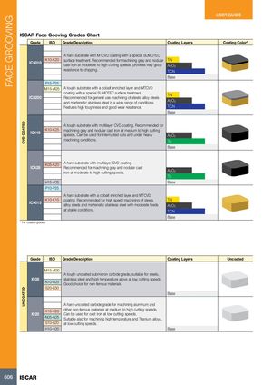 FACE GROOVING CVD COATEDUNCOATED USER GUIDE ISCAR Face Gooving Grades Chart Grade ISO Grade Description Coating Layers Coating Color* A hard substrate with MTCVD coating with a special SUMOTEC IC5010 K10-K20 surface treatment. Recommended for machining gray and nodular TiNcast iron at moderate to high cutting speeds, provides very goodAl2O3 resistance to chipping. TiCN Base P15-P35 M15-M25 A tough substrate with a cobalt enriched layer and MTCVD coating with a special SUMOTEC surface treatment. TiN IC8250 Recommended for general use machining of steels, alloy steels and martensitic stainless steel in a wide range of conditions. Al2O3 Features high toughness and good wear resistance. TiCN Base A tough substrate with multilayer CVD coating. Recommended for IC418 K10-K25 machining gray and nodular cast iron at medium to high cuttingspeeds. Can be used for interrupted cuts and under heavyAl2O3 machining conditions. Tic Base K05-K20 A hard substrate with multilayer CVD coating. IC428 Recommended for machining gray and nodular cast iron at moderate to high cutting speeds. Al2O3 Tic H15-H25 Base P10-P25 A hard substrate with a cobalt enriched layer and MTCVD IC9015 K10-K15 coating. Recommended for high speed machining of steels,alloy steels and martensitic stainless steel with moderate feedsTiNAl2O3 at stable conditions. TiCN Base * For coated grades Grade ISO Grade Description Coating Layers Uncoated M15-M30 A tough uncoated submicron carbide grade, suitable for steels, IC08 stainless steel and high temperature alloys at low cutting speeds. N10-N25 Good choice for non-ferrous materials. S20-S30 Base A hard-uncoated carbide grade for machining aluminum and K10-K20 other non-ferrous materials at medium to high cutting speeds. IC20 Can be used for cast iron at low cutting speeds. N05-N25 Suitable also for machining high temperature and Titanium alloys, S10-S20 at low cutting speeds. H10-H20 Base 606 ISCAR