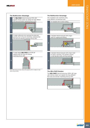 FACE GROOVING USER GUIDE The Multifunction Advantage The Multifunction Advantage The HELI-FACE internal boring bar HFIR/L MC This workpiece was machined using typewith internal coolant can replace the three different three different conventional tools. ISO tools and shorten machining time by 20%. An indexable drill for bottom drilling. 1 1 A single multifunction tool machines the whole part: A standard internal boring bar with a trigon grooving, face turning and chamfering, replacing three insert for roughing and finishing. ISO tools and reducing machining time by 40%. 2 2 A single integral HELI-FACE tool HFHPL-M A standard internal boring bar with a trigon insert replaces three ISO tools and reduces for bottom machining. This operation requires machining time by 50%. a small diameter shank and long overhang. 3 3 Note: When face grooving, reduce the speed by 40% in relation to that used in face turning. The HELI-FACE Solution The HELI-FACE internal boring bar HFIR/L MC type with internal coolant can replace the three different ISO tools and shorten machining time by 20%. 609