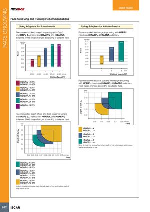 FACE GROOVING FeedDepth of Cut ap FeedDepth of Cut ap USER GUIDE Face Grooving and Turning Recommendations Using Adapters for 3 mm Inserts Using Adapters for 4-6 mm Inserts Recommended feed range for grooving with Grip 3... Recommended feed range in grooving with HFPR/L and HGPL 3... inserts and HGAIR/L and HGAER/L inserts and HFAIR/L & HFAER/L adapters. adapters. Feed range changes according to adapter type. mm/rev mm/rev 0.12 0.12 0.08 0.11 0.08 0.08 0.10 0.07 0.07 0.100.09 0.06 0.08 0.05 0.07 0.05 0.07 0.04 0.06 0.04 0.05 0.05 0.05 0.03 0.04 0.04 0.02 0.02 0.02 0.02 0.02 0.02 4 5 6 mm 40-60 40-60 40-80 40-80 40-80 m/min Width of Inserts (W) Cutting Speed Vc Recommended depth of cut and feed range in turning HGAIR/L 12-3T6HGAER/L 12-3T6 with HFPR/L inserts and HFAIR/L & HFAER/L adapters. Feed range changes according to adapter type. HGAIR/L 14-3T7 HGAER/L 14-3T7 mm 2.5 HGAIR/L 17-3T8 HGAER/L 17-3T8 2.0 HGAIR/L 21-3T9 HGAER/L 21-3T9 1.5 HGAIR/L 25-3T9 1.0 Recommended depth of cut and feed range for turning 0.5 with HGPL 3... inserts with HGAIR/L and HGAER/L adapters. Feed range changes according to adapter type. 0.05 0.1 0.15 0.2 0.25 mm/rev mm Feed 1.2 HFAIR/L- ...4 1.0 HFAER/L- ...4 0.8 HFAIR/L- ...5 HFAER/L- ...5 0.6 HFAIR/L- ...6 HFAER/L- ...6 0.4 Note: In roughing, reduce feed when depth of cut is increased, ad increase feed at small depth of cut. 0.2 0.04 0.05 0.06 0.07 0.08 0.09 0.1 0.11 0.12 mm/rev Feed HGAIR/L 21-3T9 HGAER/L 21-3T9 HGAIR/L 25-3T9 HGAIR/L 14-3T7 HGAER/L 14-3T7 HGAIR/L 17-3T8 HGAER/L 17-3T8 HGAIR/L 12-3T6 HGAER/L 12-3T6 Note: In roughing, increase feed at small depth of cut, and reduce feed at large depth of cut. 612 ISCAR