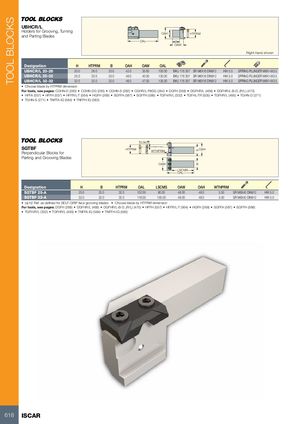 TOOL BLOCKS UBHCR/L Holders for Grooving, Turning OAH H HTPRM and Parting Blades OAL B OAW Right-hand shown Designation H HTPRM B OAH OAW OAL UBHCR/L 20-26 20.0 26.0 20.0 42.0 35.60 100.00 BKU 176 307 SR M6X16 DIN912 HW 5.0 SPRING PLUNGER M6X14X3.5 UBHCR/L 25-32 25.0 32.0 25.0 46.0 40.00 130.00 BKU 176 307 SR M6X16 DIN912 HW 5.0 SPRING PLUNGER M6X14X3.5 UBHCR/L 32-32 32.0 32.0 32.0 46.0 47.00 130.00 BKU 176 307 SR M6X16 DIN912 HW 5.0 SPRING PLUNGER M6X14X3.5 • Choose blade by HTPRM dimension For tools, see pages: CGHN-D (283) • CGHN-DG (283) • CGHN-S (282) • CGHR/L-P8DG (284) • DGFH (268) • DGFHR/L (468) • DGFHR/L-B-D..(R/L) (470) • HFFA (557) • HFFH (557) • HFFR/L-T (564) • HGFH (268) • SGFFA (587) • SGFFH (588) • TGFH/R/L (332) • TGFHL-TR (505) • TGFHR/L (495) • TGHN-D (271) • TGHN-S (271) • TNFFA-IQ (584) • TNFFH-IQ (583) h2 Ref.(a) SGTBFPerpendicular Blocks for HTPRM WTHPRM H OAH Parting and Grooving Blades OAW B LSCMS OAL Designation H B HTPRM OAL LSCMS OAW OAH WTHPRM SGTBF 25-A 25.0 25.0 32.0 102.00 80.00 48.00 48.0 5.50 SR M6X40 DIN912 HW 5.0 SGTBF 32-A 32.0 32.0 32.0 116.00 100.00 48.00 48.0 5.50 SR M6X40 DIN912 HW 5.0 • (a) h2 Ref. as defined for SELF-GRIP face grooving blades • Choose blade by HTPRM dimension For tools, see pages: DGFH (268) • DGFHR/L (468) • DGFHR/L-B-D..(R/L) (470) • HFFH (557) • HFFR/L-T (564) • HGFH (268) • SGFFA (587) • SGFFH (588) • TGFH/R/L (332) • TGFHR/L (495) • TNFFA-IQ (584) • TNFFH-IQ (583) 618 ISCAR