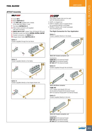 TOOL BLOCKS USER GUIDE JETCUT Assembly C Insert GF The coolant supply tube can be used D Blade SGFHK- with the following options: E Cap SGC 340 supplied with a blade; • DGTR...C integral tool to be used with Option 1 only. • DGFH-C blades used on regular blocks F Tool block SGTBUC- by connecting directly to the blade•SGTBU-C blocks withcoolant passages G Elbow-style connector unit supplied and connecting ports with each tool block H SGCU-344 H 3/16” copper Tube 343 (length 250 mm) The Right Connection for Your Application J Standard current tool blocks SGTBN, SGTBU, SGTBF K Coolant connection unit SGCU-341M Integral shank holder SGTFR/LK- Option 1:Coolant supplied directly to the blade. Option 1: Coolant supplied through the tool block. D F H C E G SGCU 341 Coolant connection unit Connectors: Option 2: CGM 343 (G1/8 external thread) Coolant supplied directly to the blade. CGF 343 (G1/8 internal thread) CF 343 (NPT1/8 internal thread) D J Option 2: Coolant supplied through the tool block. C K Option 3: Coolant supplied directly to the integral shank tool. SGCU 344 Elbow connector TUBE 343 3/16” copper tube (length 250 mm) M (G1/8 external thread) (G1/8 internal thread) (NPT1/8 external thread) (NPT1/8 internal thread) K C Option 3: Coolant supplied directly to the tool. SGCU 341 Coolant connection unit Connectors: CGM 343 (G1/8 external thread) CGF 343 (G1/8 internal thread) CF 343 (NPT1/8 internal thread) 619