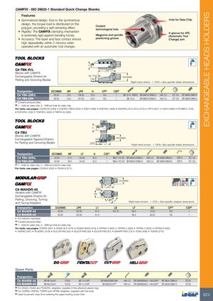 EXCHANGEABLE HEADS HOLDERS CAMFIX - ISO 26623-1 Standard Quick Change Shanks Features • Symmetrical design: Due to the symmetrical Hole for Data Chip design, the torque load is distributed on thepolygon, providing a self-centering effect.Coolanttechnological hole • Rigidity: The CAMFIX clamping mechanismis extremely rigid against bending forces.Magazine and spindle•Accuracy:The taper and facecontactensurepositioning grooveV-groove for ATC(Automatic ToolChange) arm high repeatability within 2 microns when operated with an automatic tool changer. H C#-TBK-R/L LPR Blocks with CAMFIX Exchangeable Shanks for OHX DCONMS Parting and Grooving Blades WF Right-hand shown • OHX = See specific blade dimensions Designation DCONMS WF LPR H CP(1) CDI(2) C6 TBK-32R/L 63.00 32.0 138.00 32.0 100 1 BK 32-9 WEDG SR M6X16 DIN912 HW 5.0 EZ 125 SR M8X6 DIN913 C8 TBK-52R 80.00 40.5 161.00 52.0 100 1 BK 40-9 SR M6X16 DIN912 HW 5.0 EZ 125 SR M8X6 DIN913 (1) Coolant pressure (Bar) (2) 1 - Hole for data chip, 0 - Without hole for data chip For tools, see pages: CGHN-DG (283) • CGHR/L-P8DG (284) • DGFH (268) • DGFHR/L (468) • DGFHR/L-B-D..(R/L) (470) • HFFH (557) • HGFH (268) • PCHBR/L (318) • TGFH/R/L (332) • TGFHR/L (495) • TNFFH-IQ (583) H C#-TBU Blocks with CAMFIX Exchangeable Tapered Shanks WF DCONMS for Parting and Grooving Blades OHX LF Right-hand shown • OHX= See specific blade dimensions Designation DCONMS WF LF H CDI(1) C4 TBU-32R/L 40.00 21.0 60.00 32.0 1 BKU 176 307 SR M6X25 DIN912 HW 5.0 SR M6X8 DIN916 EZP 5 EZ 125 C5 TBU-32R 50.00 30.0 64.00 32.0 1 BKU 176 307 SR M6X25 DIN912 HW 5.0 SR M6X8 DIN916 EZP 5 EZ 125 (1) 1 - Hole for data chip, 0 - Without hole for data chip For tools, see pages: CGHN-S (282) • TGHN-S (271) DCONMS 45° 45º LB C#-MAHDR-45 CDX LPR Holders with CAMFIX BD Exchangeable Shanks for Parting, Grooving, Turningand Facing Adapters L1 45°LF Right-hand shown • CDX = See specific adapter dimensions Designation DCONMS LPR L1 LB LF BD CP(1) CDI(2) C6 MAHDR-45 63.00 130.00 91.9 105.78 89.0 75.00 100 1 C8 MAHDR-45 80.00 130.00 91.9 - 89.0 80.00 100 1 • For mill-turn machines (1) Coolant pressure (Bar) (2) 1 - Hole for data chip, 0 - Without hole for data chip For tools, see pages: CGPAD (281) • DGAD-B-D (479) • DGAD/HGAD (479) • HFPAD-3 (562) • HFPAD-4 (563) • HFPAD-5 (563) • HFPAD-6 (564) • HGPAD (267) • PCADR/L (316) • SCLCR-PAD (55) • SDJCR-PAD (59) • SVJCR-PAD (67) • SWAPR-PAD (73) • TGAD (498) • TGPAD (270) Spare Parts Designation C6 MAHDR-45 SR M5-04451 T-20/5 SR 14-519(a) SR M6X20DIN7984 HW 4.0 SR M6X6DIN551 14H/22H(c) SR M5X4 DIN913 EZ 83 C8 MAHDR-45 SR M5-04451 T-20/5 SR 14-519(a) SR M6X20-XT(b) HW 5.0 SR M6X6DIN551 14H/22H(c) SR M5X6 DIN913 EZ 83 (a) For DGAD, HGAD and PCADR/L adapters; supplied in the attached plastic bag (b) For CGPAD, HGPAD, TGPAD and HFPAD adapters; supplied with the tools (c) Used to prevent chips from entering the upper locking screw hole 623