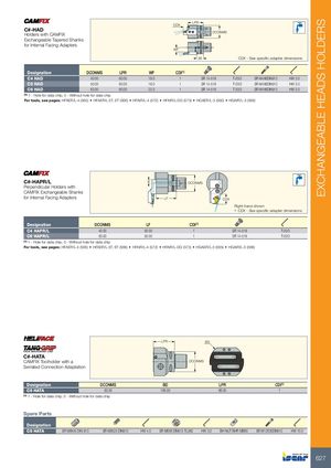 EXCHANGEABLE HEADS HOLDERS CDX LPR C#-HADHolders with CAMFIX DCONMS Exchangeable Tapered Shanks for Internal Facing Adapters WF 26 CDX - See specific adapter dimensions Designation DCONMS LPR WF CDI(1) C4 HAD 40.00 60.00 18.0 1 SR 14-519 T-20/3 SR M4X6DIN912 HW 3.0 C5 HAD 50.00 60.00 18.0 1 SR 14-519 T-20/3 SR M4X6DIN912 HW 3.0 C6 HAD 63.00 60.00 22.0 1 SR 14-519 T-20/3 SR M4X6DIN912 HW 3.0 (1) 1 - Hole for data chip, 0 - Without hole for data chip For tools, see pages: HFAER/L-4 (565) • HFAER/L-5T, 6T (566) • HFAIR/L-4 (572) • HFAIR/L-DG (573) • HGAER/L-3 (565) • HGAIR/L-3 (568) C#-HAPR/L 8 DCONMS Perpendicular Holders with CAMFIX Exchangeable Shanks for Internal Facing Adapters LF CDX Right-hand shown • CDX - See specific adapter dimensions Designation DCONMS LF CDI(1) C4 HAPR/L 40.00 50.00 1 SR 14-519 T-20/3 C6 HAPR/L 63.00 50.00 1 SR 14-519 T-20/3 (1) 1 - Hole for data chip, 0 - Without hole for data chip For tools, see pages: HFAER/L-4 (565) • HFAER/L-5T, 6T (566) • HFAIR/L-4 (572) • HFAIR/L-DG (573) • HGAER/L-3 (565) • HGAIR/L-3 (568) LPR BD C#-HATA CAMFIX Toolholder with a DCONMS Serrated Connection Adaptation Designation DCONMS BD LPR CDI(1) C6 HATA 63.00 106.00 66.00 1 (1) 1 - Hole for data chip, 0 - Without hole for data chip Spare Parts Designation C6 HATA SR M8X45 DIN 913 SR M8X25 DIN913 HW 4.0 SR M6X6 DIN913 TL360 HW 3.0 BH NUT BHR MB80 SR M12X35DIN912 HW 10.0 627