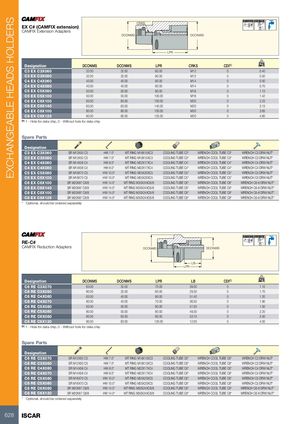 EXCHANGEABLE HEADS HOLDERS A 0.003 A 58-60 HRc CRKS EX C# (CAMFIX extension) CAMFIX Extension Adapters DCONMS DCONWS LPR Designation DCONMS DCONWS LPR CRKS CDI(1) kg C3 EX C3X060 32.00 32.00 60.00 M12 0 0.40 C3 EX C3X080 32.00 32.00 80.00 M12 0 0.50 C4 EX C4X060 40.00 40.00 60.00 M14 0 0.50 C4 EX C4X080 40.00 40.00 80.00 M14 0 0.70 C5 EX C5X080 50.00 50.00 80.00 M16 0 1.13 C5 EX C5X100 50.00 50.00 100.00 M16 0 1.42 C6 EX C6X100 63.00 63.00 100.00 M20 0 2.23 C6 EX C6X140 63.00 63.00 140.00 M20 0 3.13 C8 EX C8X100 80.00 80.00 100.00 M20 0 3.65 C8 EX C8X125 80.00 80.00 125.00 M20 0 4.60 (1) 1 - Hole for data chip, 0 - Without hole for data chip Spare Parts Designation C3 EX C3X060 SR M12X50 C3 HW 7.0* MT RING M18X15XC3 COOLING TUBE C3* WRENCH COOL TUBE C3* WRENCH C3 DRW NUT* C3 EX C3X080 SR M12X50 C3 HW 7.0* MT RING M18X15XC3 COOLING TUBE C3* WRENCH COOL TUBE C3* WRENCH C3 DRW NUT* C4 EX C4X060 SR M14X58 C4 HW 8.0* MT RING M22X17XC4 COOLING TUBE C4* WRENCH COOL TUBE C4* WRENCH C4 DRW NUT* C4 EX C4X080 SR M14X58 C4 HW 8.0* MT RING M22X17XC4 COOLING TUBE C4* WRENCH COOL TUBE C4* WRENCH C4 DRW NUT* C5 EX C5X080 SR M16X70 C5 HW 10.0* MT RING M25X20XC5 COOLING TUBE C5* WRENCH COOL TUBE C5* WRENCH C5 DRW NUT* C5 EX C5X100 SR M16X70 C5 HW 10.0* MT RING M25X20XC5 COOLING TUBE C5* WRENCH COOL TUBE C5* WRENCH C5 DRW NUT* C6 EX C6X100 SR M20X87 C6/8 HW 14.0* MT RING M30X24XC6/8 COOLING TUBE C6* WRENCH COOL TUBE C6* WRENCH C6-8 DRW NUT* C6 EX C6X140 SR M20X87 C6/8 HW 14.0* MT RING M30X24XC6/8 COOLING TUBE C6* WRENCH COOL TUBE C6* WRENCH C6-8 DRW NUT* C8 EX C8X100 SR M20X87 C6/8 HW 14.0* MT RING M30X24XC6/8 COOLING TUBE C8* WRENCH COOL TUBE C8* WRENCH C6-8 DRW NUT* C8 EX C8X125 SR M20X87 C6/8 HW 14.0* MT RING M30X24XC6/8 COOLING TUBE C8* WRENCH COOL TUBE C8* WRENCH C6-8 DRW NUT* * Optional, should be ordered separately A 0.003 A 58-60 HRc RE-C# CAMFIX Reduction Adapters DCONMS DCONWS LB LPR Designation DCONMS DCONWS LPR LB CDI(1) kg C6 RE C3X070 63.00 32.00 70.00 39.00 0 1.10 C8 RE C3X060 80.00 32.00 60.00 29.30 0 1.70 C6 RE C4X080 63.00 40.00 80.00 51.40 0 1.20 C8 RE C4X070 80.00 40.00 70.00 36.50 0 1.90 C6 RE C5X080 63.00 50.00 80.00 51.50 0 1.50 C8 RE C5X080 80.00 50.00 80.00 49.30 0 2.20 C8 RE C6X080 80.00 63.00 80.00 53.10 0 2.50 C8 RE C6X120 80.00 63.00 120.00 12.00 0 4.00 (1) 1 - Hole for data chip, 0 - Without hole for data chip Spare Parts Designation C6 RE C3X070 SR M12X50 C3 HW 7.0* MT RING M18X15XC3 COOLING TUBE C6* WRENCH COOL TUBE C6* WRENCH C3 DRW NUT* C8 RE C3X060 SR M12X50 C3 HW 7.0* MT RING M18X15XC3 COOLING TUBE C8* WRENCH COOL TUBE C8* WRENCH C3 DRW NUT* C6 RE C4X080 SR M14X58 C4 HW 8.0* MT RING M22X17XC4 COOLING TUBE C6* WRENCH COOL TUBE C6* WRENCH C4 DRW NUT* C8 RE C4X070 SR M14X58 C4 HW 8.0* MT RING M22X17XC4 COOLING TUBE C8* WRENCH COOL TUBE C8* WRENCH C4 DRW NUT* C6 RE C5X080 SR M16X70 C5 HW 10.0* MT RING M25X20XC5 COOLING TUBE C6* WRENCH COOL TUBE C6* WRENCH C5 DRW NUT* C8 RE C5X080 SR M16X70 C5 HW 10.0* MT RING M25X20XC5 COOLING TUBE C8* WRENCH COOL TUBE C8* WRENCH C5 DRW NUT* C8 RE C6X080 SR M20X87 C6/8 HW 14.0* MT RING M30X24XC6/8 COOLING TUBE C8* WRENCH COOL TUBE C8* WRENCH C6-8 DRW NUT* C8 RE C6X120 SR M20X87 C6/8 HW 14.0* MT RING M30X24XC6/8 COOLING TUBE C8* WRENCH COOL TUBE C8* WRENCH C6-8 DRW NUT* * Optional, should be ordered separately 628 ISCAR