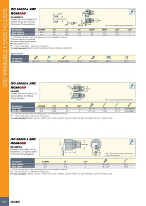 EXCHANGEABLE HEADS HOLDERS CDX IM-GHAD-8 Holders with an ISO 26622-1(*) DAXN-DAXX Tapered Shank for Grooving, DCONMSWF Turning and Facing Adapters CW CDX LF CDX - See specific adapter dimensions Designation DCONMS CW LF WF DAXN(1) DAXX(2) CDX(3) CDI(4) IM50 GHAD-8 50.00 8.00 60.00 26.00 80.0 510.0 25.00 0 IM63 GHAD-8 63.00 8.00 65.00 32.50 80.0 510.0 25.00 0 • (*) Tools with orientation holes in the flange groove can be supplied on request (1) Minimum axial grooving diameter (2) Maximum axial grooving diameter (3) Cutting depth maximum (4) 1 - Hole for data chip, 0 - Without hole for data chip For tools, see pages: GADR/L-8 (269) • GAFG-R/L-8 (562) • PCADR/L 34N-RE (301) Spare Parts Designation IM-GHAD-8 SR 14-519 T-20/5 SR M6X25 DIN912 HW 5.0 SR 76-1022 EZA 125 EZ 125 LPR CDX DCONMS IM-HAD Holders with an ISO 26622-1(*) WF Tapered Shank for Internal Facing Adapters 26 CDX - See specific adapter dimensions Designation DCONMS LPR WF CDI(1) IM40 HAD 40.00 60.00 18.0 0 SR 14-519 T-20/3 HW 3.0 SR M4X6DIN912 IM50 HAD 50.00 60.00 18.0 0 SR 14-519 T-20/3 HW 3.0 SR M4X6DIN912 • (*) Tools with orientation holes in the flange groove can be supplied on request (1) 1 - Hole for data chip, 0 - Without hole for data chip For tools, see pages: HFAER/L-4 (551) • HFAER/L-5T, 6T (552) • HFAIR/L-4 (554) • HFAIR/L-DG (555) • HGAER/L-3 (551) • HGAIR/L-3 (554) 8 DCONMS IM-HAPR/L Perpendicular Holders with an ISO 26622-1 (*) Tapered Shankfor Internal Facing Adapters LF CDX CDX - See specific adapter dimensions • Right-hand shown Designation DCONMS LF CDI(1) IM40 HAPR/L 40.00 50.00 0 SR 14-519 T-20/3 IM50 HAPR 50.00 50.00 0 SR 14-519 T-20/3 • (*) Tools with orientation holes in the flange groove can be supplied on request (1) 1 - Hole for data chip, 0 - Without hole for data chip For tools, see pages: HFAER/L-4 (551) • HFAER/L-5T, 6T (552) • HFAIR/L-4 (554) • HFAIR/L-DG (555) • HGAER/L-3 (551) • HGAIR/L-3 (554) 634 ISCAR