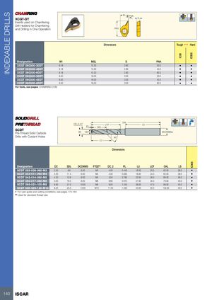 INDEXABLE DRILLS IC08 IC808IC908 W1 PNA XCGT-DT S Inserts used on Chamfering Drill Holders for Chamfering and Drilling in One Operation INSL Dimensions Tough 1 Hard Designation W1 INSL S PNA XCGT 060300-30DT 6.18 12.30 2.80 30.0 • • XCGT 060300-45DT 6.18 12.30 2.80 45.0 • • XCGT 060300-60DT 6.18 12.30 2.80 60.0 • • XCGT 090300-30DT 8.50 16.00 3.30 30.0 • • XCGT 090300-45DT 8.50 16.00 3.30 45.0 • • XCGT 090300-60DT 8.50 16.00 3.30 60.0 • • For tools, see pages: CHAMRING (139) DC_2 m7 OALLCF LS PL SDL SCDT Pre-Thread Solid Carbide DC 140° DCONMSh6 Drills with Coolant Holes 45° LU Dimensions Designation DC SDL DCONMS FTDZ(1) DC_2 PL LU LCF OAL LS SCDT 025-009-060-M3 2.50 8.8 6.00 M3 4.00 0.450 16.00 20.0 62.00 36.0 • SCDT 033-011-060-M4 3.30 11.4 6.00 M4 4.50 0.600 19.00 24.0 62.00 36.0 • SCDT 042-014-060-M5 4.20 13.6 6.00 M5 5.50 0.760 22.00 28.0 66.00 36.0 • SCDT 050-017-080-M6 5.00 16.5 8.00 M6 6.60 0.910 27.00 34.0 79.00 40.0 • SCDT 068-021-100-M8 6.80 21.0 10.00 M8 9.00 1.240 38.00 47.0 89.00 40.0 • SCDT 085-026-120-M10 8.50 25.5 12.00 M10 11.00 1.550 45.00 55.0 102.00 40.0 • • For user guide and cutting conditions, see pages 175-184 (1) Used for standard thread size 140 ISCAR