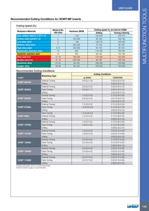 MULTIFUNCTION TOOLS USER GUIDE Recommended Cutting Conditions for XCMT-MF Inserts Cutting speed (Vc) Workpiece Materials Material No.VDI 3323Hardness (BHN) Cutting speed: Vc (m/min) for IC908DrillingTurning & Boring Low carbon steel (<0.25% C) 1 ~150 130-240 150-270 Carbon steel (≥0.25% C) 2 150-250 90-160 100-180 Low alloy steel 6 ~180 120-210 140-230 Medium alloy steel 7 200-250 70-140 80-160 High alloy steel 8, 9 250-350 50-100 60-120 Martensitic stainless steel 12 200 110-180 130-200 Austenitic stainless steel 14 200 90-160 100-180 Grey cast iron 17, 18 180-220 110-180 120-200 Ductile cast iron 15, 16 200-240 90-160 100-180 Aluminum alloy 21-24 60-130 100-500 150-600 Copper alloy 26-28 90-100 100-400 100-500 Recommended Cutting Conditions Cutting Conditions Machining Type Insert ap (mm) f (mm/rev) XCMT 040104 External TurningDrilling 0.6 (0.2-1.8) 0.05 (0.02-0.15)-0.06 (0.02-0.10) External Turning 0.8 (0.2-2.5) 0.08 (0.02-0.15) XCMT 050204 Face Turning 0.6 (0.2-1.7) 0.06 (0.02-0.13) Drilling - 0.05 (0.02-0.10) External Turning 1.0 (0.2-3.0) 0.10 (0.03-0.20) XCMT 060204 Face Turning 0.8 (0.2-2.5) 0.07 (0.03-0.15) Drilling - 0.05 (0.02-0.10) External Turning 1.3 (0.3-3.5) 0.12 (0.03-0.20) XCMT 070304 Face Turning 1.0 (0.25-3.0) 0.10 (0.03-0.18) Drilling - 0.06 (0.03-0.12) Face Turning 1.5 (0.35-4.0) 0.14 (0.06-0.25) XCMT 0803.. External Turning 1.2 (0.3-3.5) 0.12 (0.06-0.24) Drilling - 0.08 (0.05-0.16) External Turning 1.8 (0.5-3.5) 0.12 (0.06-0.30) XCMT 10T304 Face Turning 1.8 (0.5-3.5) 0.12 (0.06-0.30) Drilling - 0.08 (0.03-0.15) External Turning 1.8 (0.5-3.5) 0.20 (0.10-0.40) XCMT 10T308 Face Turning 1.8 (0.5-3.5) 0.20 (0.10-0.40) Drilling - 0.08 (0.03-0.15) External Turning 2.0 (0.6-4.3) 0.15 (0.07-0.32) XCMT 130404 Face Turning 2.0 (0.6-4.3) 0.15 (0.07-0.32) Drilling - 0.08 (0.03-0.15) External Turning 2.0 (0.6-4.3) 0.20 (0.10-0.40) XCMT 130408 Face Turning 2.0 (0.6-4.3) 0.20 (0.10-0.40) Drilling - 0.08 (0.03-0.15) External Turning 3.0 (0.7-5.3) 0.22 (0.10-0.40) XCMT 170508 Face Turning 3.0 (0.7-5.3) 0.22 (0.10-0.40) Drilling - 0.08 (0.03-0.15) Cutting parameters are for 2.25xD steel shank Internal coolant supply is recommended 145