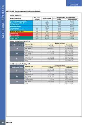 MULTIFUNCTION TOOLS USER GUIDE PICCO-MF Recommended Cutting Conditions Cutting speed (Vc) Workpiece Materials Material No.VDI 3323Hardness (BHN) Cutting Speed: Vc (m/min) for IC908DrillingTurning & Boring Low carbon steel (<0.25% C) 1 ~150 40-100 40-180 Carbon steel (≥0.25% C) 2 150-250 40-100 40-180 Low alloy steel 6 ~180 40-80 40-140 Medium alloy steel 7 200-250 40-80 40-140 High alloy steel 8, 9 250-350 40-60 40-120 Martensitic stainless steel 12 200 20-60 40-140 Austenitic stainless steel 14 200 20-60 40-140 Grey cast iron 15,16 180-220 40-140 40-140 Ductile cast iron 17,18 200-240 40-150 40-150 Aluminum alloy 21-24 60-130 50-200 150-320 Copper alloy 26-28 90-100 50-200 150-320 Feed (f) and depth of cut (ap) 2xD Cutting Conditions Tool Diameter (mm) Machining Type ap (mm) f (mm/rev) External Turning 0.8 (0.2-2.5) 0.04 (0.01-0.08) 3-4 Face Turning 0.6 (0.02-1.7) 0.03 (0.01-0.06) Drilling - 0.02 (0.01-0.06) External Turning 1.0 (0.2-3.0) 0.04 (0.01-0.08) 5-6 Face Turning 0.8 (0.2-2.5) 0.03 (0.01-0.06) Drilling - 0.03 (0.01-0.08) External Turning 1.3 (0.3-3.5) 0.04 (0.01-0.08) 7-8 Face Turning 1.0 (0.25-0.3) 0.04 (0.01-0.07) Drilling - 0.04 (0.01-0.10) Feed (f) and depth of cut (ap) 4xD Tool Diameter (mm) Machining Type Cutting Conditionsap (mm)f (mm/rev) External Turning 0.8 (0.2-2.5) 0.03 (0.01-0.07) 3-4 Face Turning 0.6 (0.02-1.7) 0.02 (0.01-0.04) Drilling - 0.02 (0.01-0.05) External Turning 1.0 (0.2-3.0) 0.03 (0.01-0.07) 5-6 Face Turning 0.8 (0.2-2.5) 0.02 (0.01-0.04) Drilling - 0.02 (0.01-0.06) External Turning 1.3 (0.3-3.5) 0.03 (0.01-0.07) 7-8 Face Turning 1.0 (0.25-0.3) 0.02 (0.01-0.04) Drilling - 0.03 (0.01-0.08) 148 ISCAR