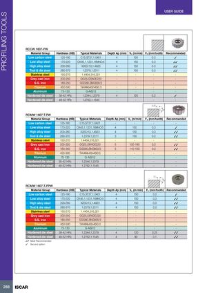 PROFILING TOOLS USER GUIDE RCCW 1607-FW Material Group Hardness (HB) Typical Materials Depth Ap (mm) Vc (m/min) Fz (mm/tooth) Recommended Low carbon steel 125-180 C15,ST37,1.0401 4 150 0.3 3 Low alloy steel 170-220 CK45,1.1231,16MnCr5 4 150 0.3 33 High alloy steel 200-260 X20Cr13,1.4923 4 150 0.3 33 Tool & die steel 280-370 1.2379,1.2311 4 150 0.3 33 Stainless steel 150-270 1.4404,316,321 - - - - Grey cast iron 200-250 GG25,GRADE220 - - - - S.G. iron 180-250 GGG60,SNG600/3 - - - - Titanium 450-500 TiAI4Mo4Sn4Si0.5 - - - - Aluminum 75-130 G-AISi12 - - - - Hardened die steel 38-42 HRc 1.2344,1.2379 4 120 0.2 3 Hardened die steel 48-52 HRc 1.2762,1.1545 - - - - 0.15 20˚ RCMW 1607-T-FW Material Group Hardness (HB) Typical Materials Depth Ap (mm) Vc (m/min) Fz (mm/tooth) Recommended Low carbon steel 125-180 C15,ST37,1.0401 - - - - Low alloy steel 170-220 CK45,1.1231,16MnCr5 4 150 0.3 3 High alloy steel 200-260 X20Cr13,1.4923 4 150 0.3 33 Tool & die steel 280-370 1.2379,1.2311 3 150 0.3 33 Stainless steel 150-270 1.4404,316,321 - - - - Grey cast iron 200-250 GG25,GRADE220 5 150-180 0.3 33 S.G. iron 180-250 GGG60,SNG600/3 5 110-150 0.3 33 Titanium 450-500 TiAI4Mo4Sn4Si0.5 - - - - Alumnum 75-130 G-AISi12 - - - - Hardened die steel 38-42 HRc 1.2344,1.2379 - - - - Hardened die steel 48-52 HRc 1.2762,1.1545 - - - - 0.1 15˚ RCMW 1607-T-FPW Material Group Hardness (HB) Typical Materials Depth Ap (mm) Vc (m/min) Fz (mm/tooth) Recommended Low carbon steel 125-180 C15,ST37,1.0401 4 150 0.3 3 Low alloy steel 170-220 CK45,1.1231,16MnCr5 4 150 0.3 33 High alloy steel 200-260 X20Cr13,1.4923 4 150 0.3 33 Tool & die steel 280-370 1.2379,1.2311 4 150 0.3 33 Stainless steel 150-270 1.4404,316,321 - - - - Grey cast iron 200-250 GG25,GRADE220 - - - - S.G. iron 180-250 GGG60,SNG600/3 - - - - Titanium 450-500 TiAI4Mo4Sn4Si0.5 - - - - Aluminum 75-130 G-AISi12 - - - - Hardened die steel 38-42 HRc 1.2344,1.2379 4 120 0.25 33 Hardened die steel 48-52 HRc 1.2762,1.1545 4 80 0.1 33 33 Most Recommended 3 Second option 288 ISCAR