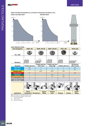 PROFILING TOOLS USER GUIDE Feed Limit Recommendations as a Function of Overhang and Depth of Cut Carbon and Alloy Steel Stainless Steel LOverhang (mm) LOverhang (mm) 300 300 250 250 200 200 L 150 150 4 6 8 10 ap (mm) 6 8 10 ap (mm) fz=0.30-0.40 fz=0.25-0.30 fz=0.20-0.25 fz=0.15 mm/tooth fz=0.12-0.20 fz=0.10-0.15 fz=0.07-0.12 mm/tooth Insert Selection Guide Insert Designation RCMT...FW RCMT...FW-T20 RCMT...FW-F20 RCCT...MO RCCW...MO RC...1206 0.15 12° 20°20°20° 12° 15° Workpiece Positive rake face Positive rake face Flat top face Geometry Positive rake face with T-Land sharp edge Positive rake face with a T-Land Alloy steel VVV V V V VVV Mold steel VVV V V V VVV Stainless steel VVV(1) VVV(2) VVV Grey cast iron VV VVV Aluminum VVV VV High temp. alloys V VV VVV Hardened mold steel(45 HRc max) V V Helical Contour Ramping Pocket Applications Interpolation Shouldering Milling Down Plunging Profiling Milling (1) Recommended for martensitic stainless steel (2) Recommended for austenitic stainless steel V Least recommended VV Second option VVV Most recommended 290 ISCAR