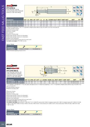 FAST FEED MILLIG TOOLS OAL FFT3 EFM-02 LH Small Diameter Endmills LU Rd° Carrying Single-Sided TriangularInserts for Fast Feed Milling DCDCX DCONMS APMX 14˚ Designation DCX(1) DC APMX AE(2) CICT(3) LU LH OAL DCONMS Shank(4) RMPX°(5) MDN(6) MDX(7) MIID(8) TQ(9) kg FFT3 EFM D08-2-060-C10-02 8.00 2.20 0.60 2.9 2 17.00 20.0 60.00 10.00 C 10.8 10.20 15.00 FFT3 TXMT 0201205T 0.5 0.03 FFT3 EFM D08-2-080-C12-02 8.00 2.20 0.60 2.9 2 26.00 30.0 80.00 12.00 C 10.8 10.20 15.00 FFT3 TXMT 0201205T 0.5 0.05 FFT3 EFM D10-3-070-C10-02 10.00 4.20 0.60 2.9 3 19.50 20.0 70.00 10.00 C 4.7 14.20 19.00 FFT3 TXMT 0201205T 0.5 0.04 FFT3 EFM D10-3-090-C12-02 10.00 4.20 0.60 2.9 3 30.00 33.0 90.00 12.00 C 4.7 14.20 19.00 FFT3 TXMT 0201205T 0.5 0.06 • Radius for programming 1.1 mm • To generate a straight surface without cusps, the width of cut must not exceed DC (1) Cutting diameter maximum (2) Maximum plunging width (3) Number of inserts (4) C-Cylindrical (5) Maximum ramping angle (6) Machinable diameter minimum for interpolation (7) Machinable diameter maximum for interpolation (8) Master insert identification (9) Recommended tightening torque (N*m) for insert screw For inserts, see pages: FFT3 TXMT 02 (445) Spare Parts Designation FFT3 EFM-02 SR M2X0.4-2.9 T6-HG(a) T-6/5 MAGNET 3X3 (a) Recommended tightening torque:0.5 N*m OAL LF DC FFT3 EFM-MM 02 Rd°DCXTHSZMSDCONMS Small Diameter Endmills with a MULTI-MASTER Threaded Adaptation Carrying Triangular APMX 14˚ Inserts for Fast Feed Milling Designation DCX(1) DC APMX AE(2) CICT(3) LF DCONMS THSZMS OAL DRVS(4) RMPX°(5) MDN(6) MDX(7) MIID(8) TQ(9) kg FFT3 EFMD08/.31-2MMT05-02 8.00 2.20 0.60 2.9 2 10.00 7.60 T05 16.75 5.5 10.8 10.20 15.00 FFT3 TXMT 0201205T 0.5 0.01 FFT3 EFMD10/.39-3MMT06-02 10.00 4.20 0.60 2.9 3 10.00 9.70 T06 16.30 8.0 4.7 14.20 19.00 FFT3 TXMT 0201205T 0.5 0.01 • For adaptation, see pages 261 • For user guide, see pages 542-547 • Radius for programing 1.1 mm • To generate a straight surface without cusps, the width of cut must not exceed DC (1) Cutting diameter maximum (2) Maximum plunging width (3) Number of inserts (4) Torque key size (5) Maximum ramping angle (6) Machinable diameter minimum for interpolation (7) Machinable diameter maximum for interpolation (8) Master insert identification (9) Recommended tightening torque (N*m) for insert screw For inserts, see pages: FFT3 TXMT 02 (445) For holders, see pages: MM CAB (667) • MM CAB-T-T (91) • MM GRT (shanks) (86) • MM S-A (stepped shanks) (84) • MM S-A (straight shanks) (87) • MM S-A-C# (86) • MM S-A-HSK (609) • MM S-A-N (85) • MM S-A-SK (90) • MM S-B (85° conical shanks) (87) • MM S-D (89° conical shanks) (88) • MM S-ER (89) • MM S-ER-H (89) • MM TS-A (86) Spare Parts Designation FFT3 EFM-MM 02 SR M2X0.4-2.9 T6-HG T-6/5 MAGNET 3X3 292 ISCAR