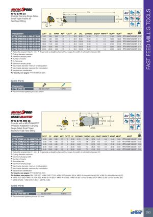 FAST FEED MILLIG TOOLS OAL FFT3 EFM-03 A LH Endmills Carrying Single-Sided Rd° Small Trigon Inserts for DCX DC DCONMS Fast Feed Milling APMX 17° A Designation DCX(1) DC APMX AE(2) CICT(3) LH OAL DCONMS Shank(4) RMPX°(5) MDN(6) MDX(7) MIID(8) kg FFT3 EFM D08-1-080-C12-03 8.00 3.60 0.60 2.2 1 20.0 80.00 12.00 C 1.1 11.60 15.00 FFT3 WXMT 030206T 0.00 FFT3 EFM D10-2-080-C10-03 10.00 5.60 0.60 2.2 2 20.0 80.00 10.00 C 6.9 15.60 19.00 FFT3 WXMT 030206T 0.11 FFT3 EFM D12-3-120-C12-03 12.00 7.60 0.60 2.2 3 25.0 120.00 12.00 C 4.7 19.60 23.00 FFT3 WXMT 030206T 0.14 FFT3 EFM D16-4-140-C16-03 16.00 11.60 0.60 2.2 4 35.0 140.00 16.00 C 2.9 27.60 31.00 FFT3 WXMT 030206T 0.18 FFT3 EFM D20-5-160-C20-03 20.00 15.60 0.60 2.2 5 43.0 160.00 20.00 C 2.0 35.60 39.00 FFT3 WXMT 030206T 0.37 FFT3 EFM D25-6-180-C25-03 25.00 20.60 0.60 2.2 6 53.0 180.00 25.00 C 1.5 45.60 49.00 FFT3 WXMT 030206T 0.62 • Radius for programming 1.1 mm • To generate a straight surface without cusps, the width of cut must not exceed DC (1) Cutting diameter maximum (2) Maximum plunging width (3) Number of inserts (4) C-Cylindrical (5) Maximum ramping angle (6) Machinable diameter minimum for interpolation (7) Machinable diameter maximum for interpolation (8) Master insert identification For inserts, see pages: FFT3 WXMT 03 (521) Spare Parts Designation FFT3 EFM-03 TS 18041I/HG(a) T-6IP/51 (a) Recommended tightening torque:0.5 Nxm OAL LF A FFT3 EFM-MM 03 DCX DC Rd°THSZMSDCONMS Endmills with a MULTI-MASTER Threaded Adaptation Carrying APMX Single-Sided Small Trigon 17° DRVS Inserts for Fast Feed Milling Designation DCX(1) DC APMX AE(2) CICT(3) LF DCONMS THSZMS OAL DRVS(4) RMPX°(5) MDN(6) MDX(7) MIID(8) kg FFT3 EFMD10/.39-2MMT06-03 10.00 5.60 0.60 2.2 2 10.00 9.70 T06 16.30 8.0 6.9 15.60 19.00 FFT3 WXMT 030206T 0.02 FFT3 EFMD12/.47-3MMT08-03 12.00 7.60 0.60 2.2 3 15.00 11.70 T08 22.50 10.0 4.7 19.60 23.00 FFT3 WXMT 030206T 0.03 FFT3 EFMD16/.63-4MMT10-03 16.00 11.60 0.60 2.2 4 20.00 15.30 T10 31.30 13.0 2.9 27.60 31.00 FFT3 WXMT 030206T 0.05 FFT3 EFMD20/.78-5MMT12-03 20.00 15.60 0.60 2.2 5 25.00 19.00 T12 38.30 16.0 2.0 35.60 39.00 FFT3 WXMT 030206T 0.07 FFT3 EFMD25/.98-6MMT15-03 25.00 20.60 0.60 2.2 6 30.00 24.00 T15 47.00 20.0 1.5 45.60 49.00 FFT3 WXMT 030206T 0.00 • Radius for programming 1.1 mm • To generate a straight surface without cusps, the width of cut must not exceed DC (1) Cutting diameter maximum (2) Maximum plunging width (3) Number of inserts (4) Torque key size (5) Maximum ramping angle (6) Machinable diameter minimum for interpolation (7) Machinable diameter maximum for interpolation (8) Master insert identification For inserts, see pages: FFT3 WXMT 03 (521) For holders, see pages: MM CAB (667) • MM CAB-T-T (91) • MM GRT (shanks) (86) • MM S-A (stepped shanks) (84) • MM S-A (straight shanks) (87) • MM S-A-C# (86) • MM S-A-HSK (609) • MM S-A-N (85) • MM S-A-SK (90) • MM S-B (85° conical shanks) (87) • MM S-D (89° conical shanks) (88) • MM S-ER (89) • MM S-ER-H (89) • MM TS-A (86) Spare Parts Designation FFT3 EFM-MM 03 TS 18041I/HG(a) T-6IP/51 (a) Recommended tightening torque: 0.5 Nxm 293