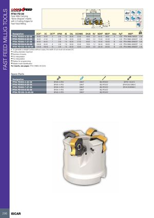 FAST FEED MILLIG TOOLS DHUB DCONMS FFX4 FD-08 Face Mills Carrying Rd° "Bone Shaped” Inserts OAL with 4 Cutting Edges for Fast Feed Milling 18˚ DC APMX DCX Designation DCX(1) DC CICT(2) APMX AE OAL DCONMS DHUB Rd° MDN(3) MDX(4) Arbor Rg(5) MIID(6) kg FFX4 FD050-4-22-08 50.00 34.40 4 2.00 7.8 50.00 22.00 48.00 3.3 84.40 99.00 A 4.00 FFX4 XNMU 080620 0.58 FFX4 FD063-5-22-08 63.00 47.40 5 2.00 7.8 45.00 22.00 48.00 2.3 110.40 125.00 A 4.00 FFX4 XNMU 080620T 0.48 FFX4 FD080-7-27-08 80.00 64.40 7 2.00 7.8 50.00 27.00 60.00 1.6 144.40 159.00 B 4.00 FFX4 XNMU 080620T 0.95 FFX4 FD100-8-32-08 100.00 84.40 8 2.00 7.8 50.00 32.00 78.00 1.2 184.40 199.00 B 4.00 FFX4 XNMU 080620T 1.24 FFX4 FD125-10-40-08 125.00 109.40 10 2.00 7.8 63.00 40.00 92.00 0.9 234.40 249.00 B 4.00 FFX4 XNMU 080620T 2.40 • To generate a straight surface without cusps, the width of cut must not exceed DC (1) Cutting diameter maximum (2) Number of inserts (3) For interpolation (4) For interpolation (5) Radius for programming (6) Master insert identification For inserts, see pages: FFX4 XNMU-08 (524) Spare Parts Designation FFX4 FD050-4-22-08 SR M5-14 IP20 SW6-T BLD IP20/S7 SR PS 118-0273 FFX4 FD063-5-22-08 SR M5-14 IP20 SW6-T BLD IP20/S7 SR M10X25 DIN912 FFX4 FD080-7-27-08 SR M5-14 IP20 SW6-T BLD IP20/S7 SR M12X30DIN912 FFX4 FD100-8-32-08 SR M5-14 IP20 SW6-T BLD IP20/S7 FFX4 FD125-10-40-08 SR M5-14 IP20 SW6-T BLD IP20/S7 296 ISCAR