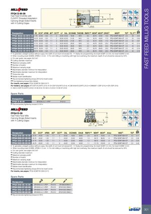 FAST FEED MILLIG TOOLS OAL LF FFQ4 D-M-09 Fast Feed Endmills with Rd° FLEXFIT Threaded Adaptation DCX DC THSZMS DCONMS Carrying Single-Sided Inserts with 4 Cutting Edges APMX DRVS Designation DC DCX(1) APMX AE(2) CICT(3) LF OAL DCONMS THSZMS RMPX°(4) MDN(5) MDX(6) DRVS(7) MIID(8) TQ(9) TQ_3(10) kg FFQ4 D022-02-M10-09 7.70 22.00 1.20 7.1 2 25.00 45.00 18.00 M10 8.2 29.70 43.00 15.0 FFQ4 SOMT 090412T 2.0 29 0.04 FFQ4 D025-02-M12-09 10.70 25.00 1.20 7.1 2 30.00 52.00 21.00 M12 5.5 35.70 49.00 17.0 FFQ4 SOMT 090412T 2.0 33 0.05 FFQ4 D025-03-M12-09 10.70 25.00 1.20 7.1 3 30.00 52.00 21.00 M12 5.5 35.70 49.00 17.0 FFQ4 SOMT 090412T 2.0 33 0.07 FFQ4 D032-03-M16-09 17.70 32.00 1.20 7.1 3 35.00 60.00 29.00 M16 3.2 49.70 63.00 25.0 FFQ4 SOMT 090412T 2.0 40 0.14 FFQ4 D032-04-M16-09 17.70 32.00 1.20 7.1 4 35.00 60.00 29.00 M16 3.2 49.70 63.00 25.0 FFQ4 SOMT 090412T 2.0 40 0.14 FFQ4 D035-05-M16-09 20.70 35.00 1.20 7.1 5 35.00 60.00 29.00 M16 2.7 55.70 69.00 25.0 FFQ4 SOMT 090412T 2.0 40 0.16 FFQ4 D040-05-M16-09 25.70 40.00 1.20 7.1 5 35.00 60.00 29.00 M16 2.0 65.70 79.00 25.0 FFQ4 SOMT 090412T 2.0 40 0.18 • To generate a straight surface without cusps, the width of cut must not exceed DC • Radius for programming: for insert SOMT 2.5 mm, for insert SOMW 3 mm • When mounting insert SOMW, APMX=1.0 mm • For slot milling or machining with high tool overhang, the maximum depth of cut should be reduced by 50% • For user guide, see pages 542-547 (1) Cutting diameter maximum (2) Maximum plunging width (3) Number of inserts (4) Maximum ramping angle (5) Machinable diameter minimum for interpolation (6) Machinable diameter maximum for interpolation (7) Torque key size (8) Master insert identification (9) Recommended tightening torque (N*m) for insert screw (10) Tool tightening torque Nxm (lbfxin) For inserts, see pages: FFQ4 SOMT/W 0904 (517) For holders, see pages: BT-ODP (FLEXFIT) (314) • C#-ODP (FLEXFIT) (314) • CAB M-M (FLEXFIT) (312) • DIN69871-ODP (315) • ER-ODP (315) • HSK A-ODP (FLEXFIT) (316) • S M (312) • S M-C-H (312) • S M-CF (313) Spare Parts Designation FFQ4 D-M-09 SR M3X0.5-L7.4 IP9(a) IP-9/151 (a) Recommended tightening torque:2.0 N*m DHUB DCONMS FFQ4 D-09 Fast Feed Face MillsCarrying Single-Sided Inserts OAL Rd° with 4 Cutting Edges 12° DCDCX APMX Designation DC DCX(1) APMX AE(2) CICT(3) OAL DCONMS DHUB RMPX°(4) MDN(5) MDX(6) Arbor MIID(7) TQ(8) kg FFQ4 D40-05-16-09 25.70 40.00 1.20 7.1 5 35.00 16.00 38.00 2.0 65.70 79.00 A FFQ4 SOMT 090412T 2.0 0.17 FFQ4 D50-07-22-09 35.70 50.00 1.20 7.1 7 40.00 22.00 48.00 1.5 85.70 99.00 A FFQ4 SOMT 090412T 2.0 0.36 FFQ4 D52-07-22-09 37.70 52.00 1.20 7.1 7 40.00 22.00 48.00 1.4 89.70 103.00 A FFQ4 SOMT 090412T 2.0 0.34 FFQ4 D63-08-22-09 48.70 63.00 1.20 7.1 8 45.00 22.00 48.00 1.1 111.70 125.00 A FFQ4 SOMT 090412T 2.0 0.49 • To generate a straight surface without cusps, the width of cut must not exceed DC • Radius for programming: for insert SOMT 2.5 mm, for insert SOMW 3 mm • When mounting insert SOMW, APMX=1.0 mm • For slot milling or machining with high tool overhang, the maximum depth of cut should be reduced by 50% • For user guide, see pages 542-547 (1) Cutting diameter maximum (2) Maximum plunging width (3) Number of inserts (4) Maximum ramping angle (5) Machinable diameter minimum for interpolation (6) Machinable diameter maximum for interpolation (7) Master insert identification (8) Recommended tightening torque (N*m) for insert screw For inserts, see pages: FFQ4 SOMT/W 0904 (517) Spare Parts Designation FFQ4 D40-05-16-09 SR M3X0.5-L7.4 IP9(a) IP-9/151 SR M8X25DIN912 FFQ4 D50-07-22-09 SR M3X0.5-L7.4 IP9(a) IP-9/151 SR M10X25 DIN912 FFQ4 D52-07-22-09 SR M3X0.5-L7.4 IP9(a) IP-9/151 SR M10X25 DIN912 FFQ4 D63-08-22-09 SR M3X0.5-L7.4 IP9(a) IP-9/151 SR M10X30 DIN912 (a) Recommended tightening torque:2.0 N*m 301