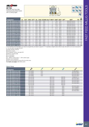 FAST FEED MILLIG TOOLS DHUB DCONMS MF FWX Moderate Feed Face Mills OAL Rd° Carrying Double-Sided Inserts with 6 Cutting Edges 30° DCDCX APMX Designation DC DCX(1) APMX CICT(2) OAL DHUB DCONMS Arbor(3) RMPX°(4) MDN(5) MDX(6) CSP(7) MIID(8) TQ(9) kg MF FWX D040-05-16-05 30.60 40.00 2.00 5 35.00 38.00 16.00 A 1.4 70.60 79.00 1 H600 WXCU 05T312T 2.0 0.17 MF FWX D050-06-22-05 40.50 50.00 2.00 6 40.00 48.00 22.00 A 1.0 90.50 99.00 1 H600 WXCU 05T312T 2.0 0.30 MF FWX D052-06-22-05 42.50 52.00 2.00 6 40.00 48.00 22.00 A 1.0 94.50 103.00 1 H600 WXCU 05T312T 2.0 0.32 MF FWX D063-08-22-05 53.50 63.00 2.00 8 40.00 48.00 22.00 A 0.8 116.50 125.00 1 H600 WXCU 05T312T 2.0 0.41 MF FWX D040-04-16-07 27.70 40.00 2.70 4 35.00 38.00 16.00 A 2.0 67.70 79.00 1 H600 WXCU 070515HP 4.8 0.17 MF FWX D050-05-22-07 37.70 50.00 2.70 5 40.00 48.00 22.00 A 1.4 87.70 99.00 1 H600 WXCU 070515HP 4.8 0.31 MF FWX D052-05-22-07 39.70 52.00 2.70 5 40.00 48.00 22.00 A 1.3 91.70 103.00 1 H600 WXCU 070515HP 4.8 0.32 MF FWX D063-06-22-07 50.70 63.00 2.70 6 40.00 48.00 22.00 A 1.0 113.70 125.00 1 H600 WXCU 070515HP 4.8 0.42 MF FWX D080-07-32-07 67.70 80.00 2.70 7 55.00 76.00 32.00 A 0.8 147.70 159.00 1 H600 WXCU 070515HP 4.8 1.21 MF FWX D100-08-32-07 87.70 100.00 2.70 8 50.00 78.00 32.00 B 0.6 187.70 199.00 1 H600 WXCU 070515HP 4.8 1.46 MF FWX D050-04-22-08 34.70 50.00 3.50 4 45.00 48.00 22.00 A 2.5 84.70 99.00 1 H600 WXCU 080612T 9.0 0.32 MF FWX D063-05-27-08 47.70 63.00 3.50 5 50.00 61.00 27.00 A 1.7 110.70 125.00 1 H600 WXCU 080612T 9.0 0.63 MF FWX D066-05-27-08 50.70 66.00 3.50 5 50.00 61.00 27.00 A 1.7 116.70 131.00 1 H600 WXCU 080612T 9.0 0.64 MF FWX D080-06-32-08 64.70 80.00 3.50 6 55.00 76.00 32.00 A 1.2 144.70 159.00 1 H600 WXCU 080612T 9.0 1.13 MF FWX D100-07-32-08 84.70 100.00 3.50 7 50.00 78.00 32.00 B 0.9 184.70 199.00 1 H600 WXCU 080612T 9.0 1.37 MF FWX D125-09-40-08 109.70 125.00 3.50 9 55.00 90.00 40.00 B 0.7 234.70 249.00 1 H600 WXCU 080612T 9.0 2.36 MF FWX D160-11-40-08 144.70 160.00 3.50 11 55.00 95.00 40.00 C 0.5 304.70 319.00 0 H600 WXCU 080612T 9.0 3.63 • For machining recommendations and radius for programming, see table on page 522 • To generate a straight surface without cusps, the width of cut must not exceed DC • For user guide, see pages 542-547 (1) Cutting diameter maximum (2) Number of inserts (3) For adaptation options, see page 548 (4) Maximum ramping angle (5) For interpolation (6) For interpolation (7) 0 - Without coolant supply, 1 - With coolant supply (8) Master insert identification (9) Recommended tightening torque (N*m) for insert screw For inserts, see pages: H600 WXCU (522) Spare Parts Designation MF FWX D040-05-16-05 SR 10508600 T-9/51 SR M8X25DIN912 MF FWX D050-06-22-05 SR 10508600 T-9/51 SR M10X25 DIN912 MF FWX D052-06-22-05 SR 10508600 T-9/51 SR M10X25 DIN912 MF FWX D063-08-22-05 SR 10508600 T-9/51 SR M10X25 DIN912 MF FWX D040-04-16-07 SR 34-535-SN BLD T15/S7 SW6-T-SH SR M8X25-D11.5 MF FWX D050-05-22-07 SR 34-535-SN BLD T15/S7 SW6-T-SH SR M10X25 DIN912 MF FWX D052-05-22-07 SR 34-535-SN BLD T15/S7 SW6-T-SH SR M10X25 DIN912 MF FWX D063-06-22-07 SR 34-535-SN BLD T15/S7 SW6-T-SH SR M10X25 DIN912 MF FWX D080-07-32-07 SR 34-535-SN BLD T15/S7 SW6-T-SH SR M16X30 DIN912 MF FWX D100-08-32-07 SR 34-535-SN BLD T15/M7 SW6-T-SH MF FWX D050-04-22-08 SR 14-591/H BLD T20/S7 SW6-T SR M10X25 DIN912 MF FWX D063-05-27-08 SR 14-591/H BLD T20/S7 SW6-T SR M12X30DIN912 MF FWX D066-05-27-08 SR 14-591/H BLD T20/S7 SW6-T SR M12X30DIN912 MF FWX D080-06-32-08 SR 14-591/H BLD T20/S7 SW6-T SR M16X30 DIN912 MF FWX D100-07-32-08 SR 14-591/H BLD T20/M7 SW6-T MF FWX D125-09-40-08 SR 14-591/H BLD T20/L7 SW6-T MF FWX D160-11-40-08 SR 14-591/H BLD T20/L7 SW6-T 307