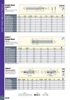 FAST FEED MILLIG TOOLS A 0.005 A 58-60 HRc BHTA DCONMSSM THSZWS BD Shanks for Tools with FLEXFIT LDRED Threaded Connection OAL A B Designation OAL LDRED DCONMS Shank BD BHTA THSZWS Type kg S M06-L60 C10 60.00 20.0 10.00 C 9.70 - M06 A 0.03 S M06-L105-C12 105.00 60.0 12.00 C 9.70 1.2 M06 B 0.06 S M06-L125-C16 125.00 60.0 16.00 C 9.70 3.3 M06 B 0.13 S M08-L73 C16 73.00 25.0 16.00 C 13.00 - M08 A 0.09 S M08-L128-C16 128.00 80.0 16.00 C 13.00 0.9 M08 B 0.15 S M08-L170-C20 170.00 66.8 20.00 C 13.00 3.3 M08 B 0.33 S M10-L80 C20 80.00 30.0 20.00 C 18.00 - M10 A 0.16 S M10-L130-C20 130.00 80.0 20.00 C 18.00 0.6 M10 B 0.25 S M10-L200-C25 200.00 57.2 25.00 C 19.00 3.3 M10 B 0.65 S M12-L86-C25 86.00 30.0 25.00 C 21.00 5.1 M12 A 0.27 S M12-L200-C32 200.00 78.0 32.00 C 21.00 4.4 M12 B 1.02 S M16-L95-C32 95.00 35.0 32.00 C 29.00 1.7 M16 A 0.50 S M16-L230-C32 230.00 50.0 32.00 C 29.00 1.8 M16 B 1.27 OAL LU S M-C-H Carbide Shanks with Coolant BD DCONMS Channels for Tools with FLEXFIT Threaded Connection BD2 THSZWS Designation DCONMS THSZWS OAL LU BD BD_2 kg S M08-L150-C16-C-H 16.00 M08 150.00 80.0 15.30 15.30 0.39 S M08-L200-C16-C-H 16.00 M08 200.00 140.0 15.30 15.30 0.59 S M08-L250-C16-C-H 16.00 M08 250.00 180.0 15.30 15.30 0.84 S M10-L150-C20-C-H 20.00 M10 150.00 80.0 18.50 18.50 0.73 S M10-L200-C20-C-H 20.00 M10 200.00 140.0 18.00 17.50 0.91 S M10-L250-C20-C-H 20.00 M10 250.00 180.0 18.00 17.50 1.04 S M12-L200-C25-C-H 25.00 M12 200.00 100.0 21.00 20.50 1.41 S M12-L250-C25-C-H 25.00 M12 250.00 180.0 24.00 24.00 1.78 S M12-L300-C25-C-H 25.00 M12 300.00 180.0 21.00 20.50 2.04 S M16-L200-C32-C-H 32.00 M16 200.00 100.0 29.00 29.00 2.11 S M16-L250-C32-C-H 32.00 M16 250.00 180.0 29.00 29.00 2.36 S M16-L300-C32-C-H 32.00 M16 300.00 180.0 29.00 29.00 2.81 • For adaptation options, see page 311 2 1 A 0.005 A DRVS BD CAB M-M (FLEXFIT) BHTA Reducers and Extensions THSZMSwith Coolant Holes for the THSZWS BD DCONMS THSZMS 58-60 HRcTHSZWS Modular FLEXFIT System LSCMS LPR DRVS LU LSCMS LPR CAB M-M-C CAB M-M Designation THSZWS THSZMS BD LPR LU DCONMS LSCMS DRVS(1) Fig. BHTA kg CAB M06M08 M06 M08 9.70 30.00 24.80 13.00 17.50 9.5 1. 5.7 0.02 CAB M08M08-C M08 M08 13.00 30.00 - - 17.50 9.6 2. - 0.02 CAB M08M10 M08 M10 13.00 40.00 33.40 18.00 20.20 15.0 1. 5.2 0.07 CAB M10M10-C M10 M10 18.00 35.00 - - 20.00 15.0 2. - 0.06 CAB M10M12 M10 M12 18.00 45.00 36.40 21.00 22.00 17.0 1. 2.5 0.09 CAB M12M12-C M12 M12 21.00 40.00 - - 22.00 17.0 2. - 0.08 CAB M12M16 M12 M16 21.00 50.00 42.50 29.00 25.00 25.0 1. 6.3 0.18 CAB M16M16-C M16 M16 29.00 40.00 - - 25.00 25.0 2. - 0.16 (1) Clamping wrench size SHANK CAB... HCM-M 312 ISCAR SHANK S M...-CF4 CDP