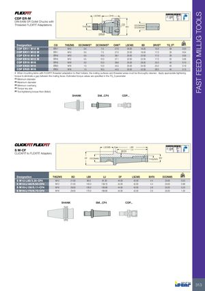 FAST FEED MILLIG TOOLS A 0.003 A 58-60 HRc LSCMS OHN CDP ER-M DIN 6499 ER Collet Chucks with Threaded FLEXFIT Adaptations THSZMS CSI BD DCONNWSDCONXWS DRVS Designation CSI THSZMS DCONNWS(1) DCONXWS(2) OHN(3) LSCMS BD DRVS(4) TQ_3(5) kg CDP ER11 M10 M ER11 M10 0.5 7.0 27.0 20.00 16.00 15.0 29 0.03 CDP ER11 M12 M ER11 M12 0.5 7.0 27.0 22.00 16.00 17.0 33 0.04 CDP ER16 M10 M ER16 M10 0.5 10.0 38.1 20.00 22.00 17.0 29 0.05 CDP ER16 M12 M ER16 M12 0.5 10.0 37.1 22.00 22.00 17.0 33 0.06 CDP ER16 M16 ER16 M16 0.5 10.0 36.6 25.00 28.00 25.0 40 0.10 CDP ER20 M16 ER20 M16 1.0 13.0 45.5 25.00 34.00 25.0 40 0.19 CDP ER25 M16 ER25 M16 1.0 16.0 44.5 25.00 42.00 28.0 40 0.15 • When mounting items with FLEXFIT threaded adaptation to their holders, the mating surfaces and threaded areas must be thoroughly cleaned. Apply appropriate tightening torque to eliminate a gap between the mating faces. Estimated torque values are specified in the TQ_3 parameter (1) Minimum diameter (2) Maximum diameter (3) Minimum overhang (4) Torque key size (5) Tool tightening torque Nxm (lbfxin) SHANK SM...CF4 CDP... LSCMS 8 LBX A 0.005 A 58-60 HRc S M-CF LUBHTA CLICKFIT to FLEXFIT Adapters DF DCONMS THSZWS BD Designation THSZWS BD LBX LU DF LSCMS BHTA DCONMS kg S M12-L85/3.30-CF4 M12 21.00 85.0 81.30 44.00 42.00 4.4 25.00 0.23 S M12-L140/5.50-CF4 M12 21.00 140.0 139.10 44.00 42.00 4.4 25.00 0.98 S M16-L130/5.11-CF4 M16 29.00 130.0 126.80 44.00 42.00 2.6 25.00 0.23 S M16-L170/6.70-CF4 M16 29.00 170.0 168.60 44.00 42.00 2.0 25.00 1.30 SHANK SM...CF4 CDP... 313