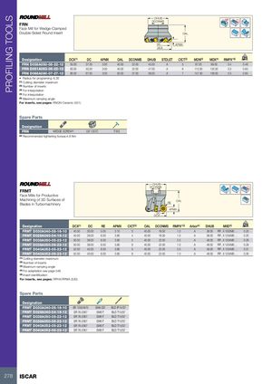 PROFILING TOOLS DHUB Rd° DCONMS FRN Face Mill for Wedge-Clamped Double-Sided Round Insert OAL DC APMX DCX Designation DCX(1) DC APMX OAL DCONMS DHUB STDLET CICT(2) MDN(3) MDX(4) RMPX°(5) kg FRN D038A050-05-22-12 50.00 37.30 3.00 40.00 22.00 45.00 A 5 87.30 99.00 0.4 0.46 FRN D051A063-06-22-12 63.00 50.30 3.00 40.00 22.00 47.00 A 6 113.30 125.00 0.3 0.63 FRN D068A080-07-27-12 80.00 67.30 3.00 50.00 27.00 58.00 A 7 147.30 159.00 0.3 0.85 • Radius for programing: 6.35 (1) Cutting diameter maximum (2) Number of inserts (3) For interpolation (4) For interpolation (5) Maximum ramping angle For inserts, see pages: RNGN-Ceramic (531) Spare Parts Designation FRN WEDGE SCREW(a) LW 1207C T-W3 (a) Recommended tightening torque:4.8 Nm DHUB DCONMS Rd° FRMT Face Mills for Productive Machining of 3D Surfaces ofBlades in Turbomachinery RE OAL APMX DC DCX Designation DCX(1) DC RE APMX CICT(2) OAL DCONMS RMPX°(3) Arbor(4) DHUB MIID(5) kg FRMT D030A040-05-16-10 40.00 30.00 5.00 3.10 5 40.00 16.00 1.0 A 38.00 RP...X 1003M0 ... 0.20 FRMT D028A040-04-16-12 40.00 28.00 6.00 3.80 4 40.00 16.00 1.0 A 38.00 RP...X 1204M0 ... 0.20 FRMT D038A050-05-22-12 50.00 38.00 6.00 3.80 5 40.00 22.00 2.5 A 48.00 RP...X 1204M0 ... 0.29 FRMT D038A050-06-22-12 50.00 38.00 6.00 3.80 6 40.00 22.00 1.0 A 48.00 RP...X 1204M0 ... 0.29 FRMT D040A052-05-22-12 52.00 40.00 6.00 3.80 5 40.00 22.00 2.5 A 48.00 RP...X 1204M0 ... 0.31 FRMT D040A052-06-22-12 52.00 40.00 6.00 3.80 6 40.00 22.00 1.0 A 48.00 RP...X 1204M0 ... 0.30 (1) Cutting diameter maximum (2) Number of inserts (3) Maximum ramping angle (4) For adaptation see page 548 (5) Insert identification For inserts, see pages: RPHX/RPMX (530) Spare Parts Designation FRMT D030A040-05-16-10 SR 10504970 SW6-SD BLD IP15/S7 FRMT D028A040-04-16-12 SR 76-2067 SW6-T BLD T15/S7 FRMT D038A050-05-22-12 SR 76-2067 SW6-T BLD T15/S7 FRMT D038A050-06-22-12 SR 76-2067 SW6-T BLD T15/S7 FRMT D040A052-05-22-12 SR 76-2067 SW6-T BLD T15/S7 FRMT D040A052-06-22-12 SR 76-2067 SW6-T BLD T15/S7 278 ISCAR