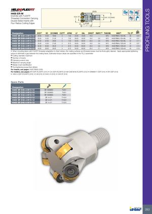 PROFILING TOOLS DRVS H400 ER-M Endmills with FLEXFITThreaded Connection Carrying DCX DC THSZMS DCONMS Rd° Double-Sided Inserts with Four Radius Cutting Edges APMX LF OAL Designation DCX(1) DC DCONMS CICT(2) APMX LF OAL DRVS(3) RMPX°(4) THSZMS MIID(5) TQ_3(6) kg H400 ER D20-2-M10-10 20.00 10.00 16.60 2 7.50 25.00 45.00 15.0 - M10 H400 RNHU 1004-ML 29 0.04 H400 ER D25-3-M12-10 25.00 15.00 21.00 3 7.50 28.00 50.00 19.0 5.8 M12 H400 RNHU 1004-ML 33 0.07 H400 ER D32-5-M16-10 32.00 22.00 29.60 5 7.50 35.00 60.00 25.0 3.8 M16 H400 RNHU 1004-ML 40 0.17 H400 ER D25-2-M12-12 25.00 13.00 21.60 2 8.70 28.00 50.00 19.0 5.6 M12 H400 RNHU 1205-AX 33 0.07 H400 ER D32-4-M16-12 32.00 20.00 28.40 4 8.70 35.00 60.00 25.0 5.6 M16 H400 RNHU 1205-AX 40 0.15 H400 ER D40-5-M16-12 40.00 28.00 29.00 5 8.70 35.00 60.00 25.0 3.7 M16 H400 RNHU 1205-AX 40 0.19 • When mounting items with FLEXFIT threaded adaptation to their holders, the mating surfaces and threaded areas must be thoroughly cleaned. Apply appropriate tightening torque to eliminate a gap between the mating faces. Estimated torque values are specified in the TQ_3 parameter (1) Cutting diameter maximum (2) Number of inserts (3) Clamping wrench size (4) Maximum ramping angle (5) Master insert identification (6) Tool tightening torque Nxm (lbfxin) For inserts, see pages: H400 RNHU (532) For holders, see pages: BT-ODP (FLEXFIT) (314) • C#-ODP (FLEXFIT) (314)• CAB M-M (FLEXFIT) (312) • DIN69871-ODP (315) • ER-ODP (315) • HSK A-ODP (FLEXFIT) (316) • S M (312) • S M-C-H (312) • S M-CF (313) Spare Parts Designation H400 ER D20-2-M10-10 SR 10508600 T-9/51 H400 ER D25-3-M12-10 SR 10508600 T-9/51 H400 ER D32-5-M16-10 SR 10508600 T-9/51 H400 ER D25-2-M12-12 SR 14-571 T-10/51 H400 ER D32-4-M16-12 SR 14-571 T-10/51 H400 ER D40-5-M16-12 SR 14-571 T-10/51 283