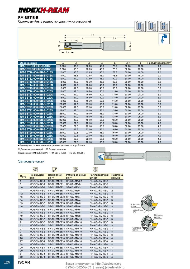 RM-SET-B-B Однолезвийные развертки для глухих отверстий L2 L L4 L5 Dr d L3 Обозначение D r L 3 L 2 L 4 L L 5 (1) d Посадочное место (2) RM-SET8.000H6B-B-C16S 8.000 15.5 123.5 45.0 78.5 30.00 16.00 1.0 RM-SET9.000H6B-B-C16S 9.000 15.5 123.5 45.0 78.5 30.00 16.00 1.0 RM-SET10.000H6B-B-C16S 10.000 15.5 123.5 45.0 78.5 30.00 16.00 2.0 RM-SET11.000H6B-B-C16S 11.000 15.5 123.5 45.0 78.5 30.00 16.00 2.0 RM-SET12.000H6B-B-C16S 12.000 17.0 135.0 45.0 90.0 30.00 16.00 3.0 RM-SET13.000H6B-B-C16S 13.000 17.0 135.0 45.0 90.0 30.00 16.00 3.0 RM-SET14.000H6B-B-C16S 14.000 17.0 135.0 45.0 90.0 30.00 16.00 3.0 RM-SET15.000H6B-B-C16S 15.000 17.0 135.0 45.0 90.0 30.00 16.00 3.0 RM-SET16.000H6B-B-C20S 16.000 17.0 165.0 50.0 115.0 30.00 20.00 3.0 RM-SET17.000H6B-B-C20S 17.000 17.0 165.0 50.0 115.0 30.00 20.00 3.0 RM-SET18.000H6B-B-C20S 18.000 17.0 165.0 50.0 115.0 30.00 20.00 3.0 RM-SET19.000H6B-B-C20S 19.000 17.0 165.0 50.0 115.0 30.00 20.00 3.0 RM-SET20.000H6B-B-C25S 20.000 17.0 171.0 56.0 115.0 30.00 25.00 3.0 RM-SET21.000H6B-B-C25S 21.000 17.0 171.0 56.0 115.0 30.00 25.00 3.0 RM-SET22.000H6B-B-C25S 22.000 17.0 191.0 56.0 135.0 30.00 25.00 3.0 RM-SET23.000H6B-B-C25S 23.000 17.0 191.0 56.0 135.0 30.00 25.00 3.0 RM-SET24.000H6B-B-C25S 24.000 17.0 191.0 56.0 135.0 30.00 25.00 3.0 RM-SET25.000H6B-B-C25S 25.000 17.0 191.0 56.0 135.0 30.00 25.00 3.0 RM-SET26.000H6B-B-C25S 26.000 22.5 221.0 56.0 165.0 30.00 25.00 4.0 RM-SET27.000H6B-B-C25S 27.000 22.5 221.0 56.0 165.0 30.00 25.00 4.0 RM-SET28.000H6B-B-C25S 28.000 22.5 221.0 56.0 165.0 30.00 25.00 4.0 RM-SET29.000H6B-B-C25S 29.000 22.5 221.0 56.0 165.0 30.00 25.00 4.0 RM-SET30.000H6B-B-C25S 30.000 22.5 221.0 56.0 165.0 30.00 25.00 4.0 RM-SET31.000H6B-B-C25S 31.000 22.5 221.0 56.0 165.0 30.00 25.00 4.0 RM-SET32.000H6B-B-C25S 32.000 22.5 221.0 56.0 165.0 30.00 25.00 4.0 • Руководство по эксплуатации и режимы резания см. стр. E29-40. (1) Длина направляющей • (2) Размер пластины Пластины см.: RM-SEI-A (E27) • RM-SEI-B (E28) • RM-SEI-C (E28). Запасные части Прижимной Прижимной Регулировочный Регулировочный Пластина D [мм] клин винт винт штифт размер 8 WDG-RM-SE-1 SR-CL-RM-SE-1 SR-ADJ-M3x2.5 PIN-ADJ-RM-SE-1 1 9 WDG-RM-SE-1 SR-CL-RM-SE-1 SR-ADJ-M3x3 PIN-ADJ-RM-SE-1 1 10 WDG-RM-SE-2 SR-CL-RM-SE-1 SR-ADJ-M3x3 PIN-ADJ-RM-SE-2 2 11 WDG-RM-SE-2 SR-CL-RM-SE-1 SR-ADJ-M3x4 PIN-ADJ-RM-SE-2 2 12 WDG-RM-SE-3 SR-CL-RM-SE-3 SR-ADJ-M4x4 PIN-ADJ-RM-SE-3 3 13 WDG-RM-SE-3 SR-CL-RM-SE-3 SR-ADJ-M4x4 PIN-ADJ-RM-SE-3 3 14 WDG-RM-SE-3 SR-CL-RM-SE-3 SR-ADJ-M4x4 PIN-ADJ-RM-SE-3 3 15 WDG-RM-SE-3 SR-CL-RM-SE-3 SR-ADJ-M4x6 PIN-ADJ-RM-SE-3 3 Adjustment 16 WDG-RM-SE-3 SR-CL-RM-SE-3 SR-ADJ-M4x6 PIN-ADJ-RM-SE-3 3 Screw 17 WDG-RM-SE-3 SR-CL-RM-SE-3 SR-ADJ-M4x8 PIN-ADJ-RM-SE-3 3 Adjustment 18 WDG-RM-SE-3 SR-CL-RM-SE-3 SR-ADJ-M4x8 PIN-ADJ-RM-SE-3 3 Pin 19 WDG-RM-SE-3 SR-CL-RM-SE-3 SR-ADJ-M4x8 PIN-ADJ-RM-SE-3 3 Clamping Wedge 20 WDG-RM-SE-3 SR-CL-RM-SE-3 SR-ADJ-M4x10 PIN-ADJ-RM-SE-3 3 21 WDG-RM-SE-3 SR-CL-RM-SE-3 SR-ADJ-M4x10 PIN-ADJ-RM-SE-3 3 22 WDG-RM-SE-3 SR-CL-RM-SE-3 SR-ADJ-M4x10 PIN-ADJ-RM-SE-3 3 23 WDG-RM-SE-3 SR-CL-RM-SE-3 SR-ADJ-M4x10 PIN-ADJ-RM-SE-3 3 Clamping Screw 24 WDG-RM-SE-3 SR-CL-RM-SE-3 SR-ADJ-M4x10 PIN-ADJ-RM-SE-3 3 25 WDG-RM-SE-3 SR-CL-RM-SE-3 SR-ADJ-M4x10 PIN-ADJ-RM-SE-3 3 26 WDG-RM-SE-4 SR-CL-RM-SE-4 SR-ADJ-M4x10 PIN-ADJ-RM-SE-4 4 27 WDG-RM-SE-4 SR-CL-RM-SE-4 SR-ADJ-M4x10 PIN-ADJ-RM-SE-4 4 28 WDG-RM-SE-4 SR-CL-RM-SE-4 SR-ADJ-M4x10 PIN-ADJ-RM-SE-4 4 29 WDG-RM-SE-4 SR-CL-RM-SE-4 SR-ADJ-M4x10 PIN-ADJ-RM-SE-4 4 30 WDG-RM-SE-4 SR-CL-RM-SE-4 SR-ADJ-M4x10 PIN-ADJ-RM-SE-4 4 31 WDG-RM-SE-4 SR-CL-RM-SE-4 SR-ADJ-M4x10 PIN-ADJ-RM-SE-4 4 32 WDG-RM-SE-4 SR-CL-RM-SE-4 SR-ADJ-M4x10 PIN-ADJ-RM-SE-4 4 E26 ISCAR Заказ инструмента: http://steelcam.org 8 (343) 382-52-03 | sales@sverla-ekb.ru