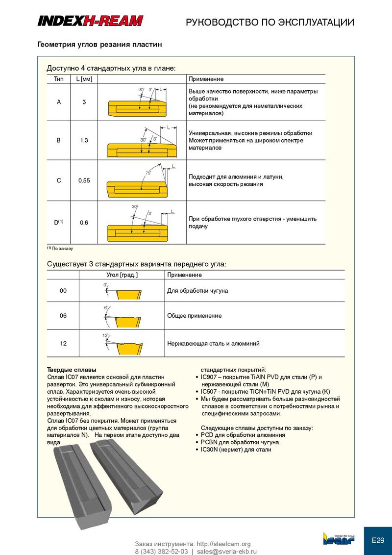 РУКОВОДСТВО ПО ЭКСПЛУАТАЦИИ Геометрия углов резания пластин Доступно 4 стандартных угла в плане: Тип L [мм] Применение 15˚ 3˚ L Выше качество поверхности, ниже параметры обработки A 3 (не рекомендуется для неметаллических материалов) L Универсальная, высокие режимы обработки B 1.3 30˚ 3˚ Может применяться на широком спектре материалов L 75˚ Подходит для алюминия и латуни, C 0.55 высокая скорость резания 30˚ L 3˚ При обработке глухого отверстия - уменьшить D (1) 0.6 подачу (1) По заказу Существует 3 стандартных варианта переднего угла: Угол [град.] Применение 0˚ 00 Для обработки чугуна 6˚ 06 Общее применение 12˚ 12 Нержавеющая сталь и алюминий твердые сплавы стандартных покрытий: Сплав IC07 является основой для пластин • IC907 – покрытие TiAlN PVD для стали (P) и разверток. Это универсальный субмикронный нержавеющей стали (M) сплав. Характеризуется очень высокой • IC507 - покрытие TiCN+TiN PVD для чугуна (K) устойчивостью к сколам и износу, которая • Мы будем рассматривать больше разновидностей необходима для эффективного высокоскоростного сплавов в соответствии с потребностями рынка и развертывания. специфическими запросами. Сплав IC07 без покрытия. Может применяться для обработки цветных материалов (группа Следующие сплавы доступны по заказу: материалов N). На первом этапе доступно два • PCD для обработки алюминия вида • PCBN для обработки чугуна • IC30N (кермет) для стали E29 Заказ инструмента: http://steelcam.org 8 (343) 382-52-03 | sales@sverla-ekb.ru