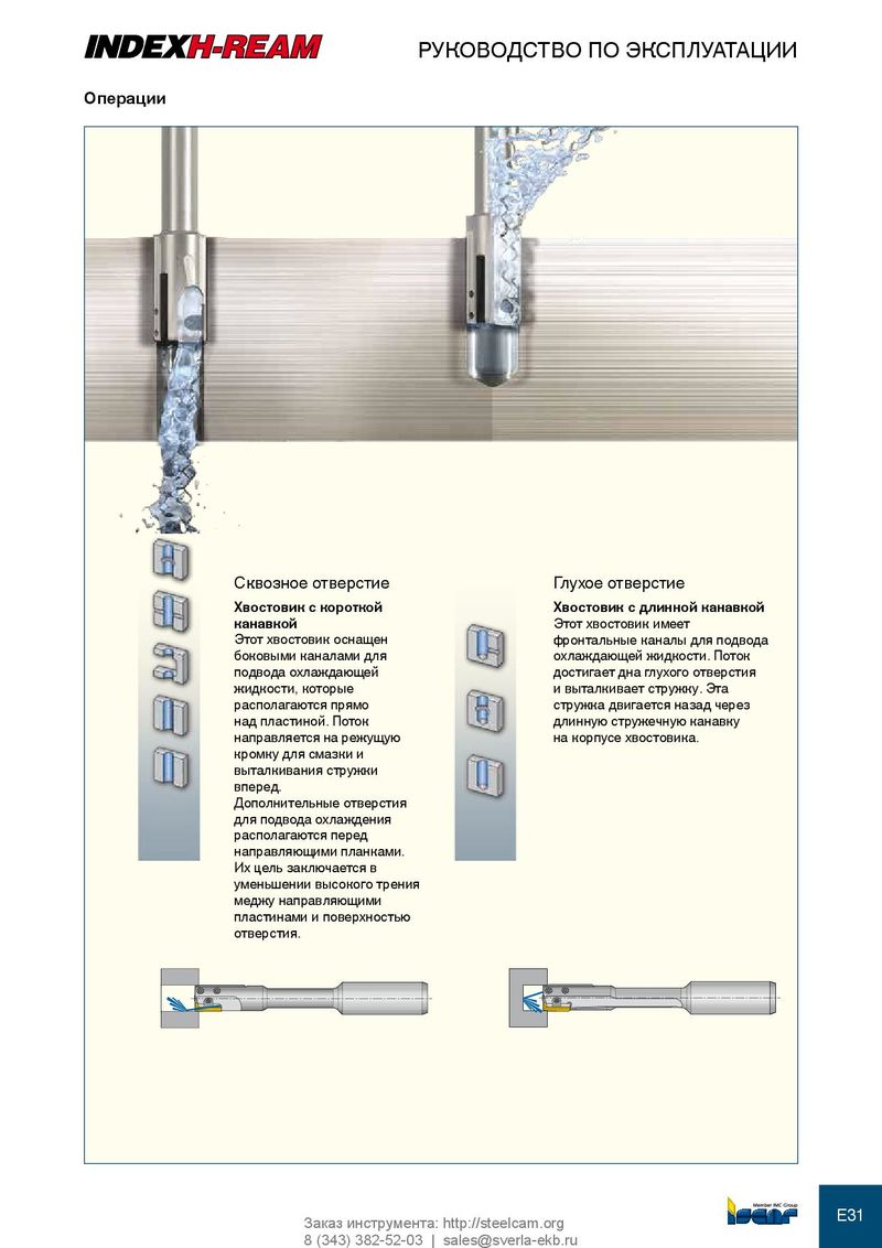 РУКОВОДСТВО ПО ЭКСПЛУАТАЦИИ Операции Сквозное отверстие Глухое отверстие Хвостовик с короткой Хвостовик с длинной канавкой канавкой Этот хвостовик имеет Этот хвостовик оснащен фронтальные каналы для подвода боковыми каналами для охлаждающей жидкости. Поток подвода охлаждающей достигает дна глухого отверстия жидкости, которые и выталкивает стружку. Эта располагаются прямо стружка двигается назад через над пластиной. Поток длинную стружечную канавку направляется на режущую на корпусе хвостовика. кромку для смазки и выталкивания стружки вперед. Дополнительные отверстия для подвода охлаждения располагаются перед направляющими планками. Их цель заключается в уменьшении высокого трения меджу направляющими пластинами и поверхностью отверстия. E31 Заказ инструмента: http://steelcam.org 8 (343) 382-52-03 | sales@sverla-ekb.ru