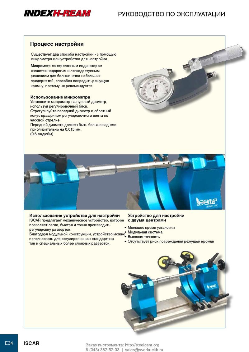 РУКОВОДСТВО ПО ЭКСПЛУАТАЦИИ Процесс настройки Существует два способа настройки - с помощью микрометра или устройства для настройки. Микрометр со стрелочным индикатором является недорогим и легкодоступным решением для большинства небольших предприятий, способен повредить режущую кромку, поэтому не рекомендуется использование микрометра Установите микрометр на нужный диаметр, используя регулировочный блок. Отрегулируйте передний диаметр и обратный конуc вращением регулировочного винта по часовой стрелке. Передний диаметр должен быть больше заднего приблизительно на 0.015 мм. (0.6 мкдюйм) использование устройства для настройки Устройство для настройки ISCAR предлагает механическое устройство, которое с двумя центрами позволяет легко, быстро и точно производить • Меньшее время установки регулировку разверток. • Модульная система Благодаря модульной конструкции, устройство можно • Высокая точность использовать для регулировки как стандартных • Отсутствует риск повреждения режущей кромки так и специальных более сложных разверток. E34 ISCAR Заказ инструмента: http://steelcam.org 8 (343) 382-52-03 | sales@sverla-ekb.ru