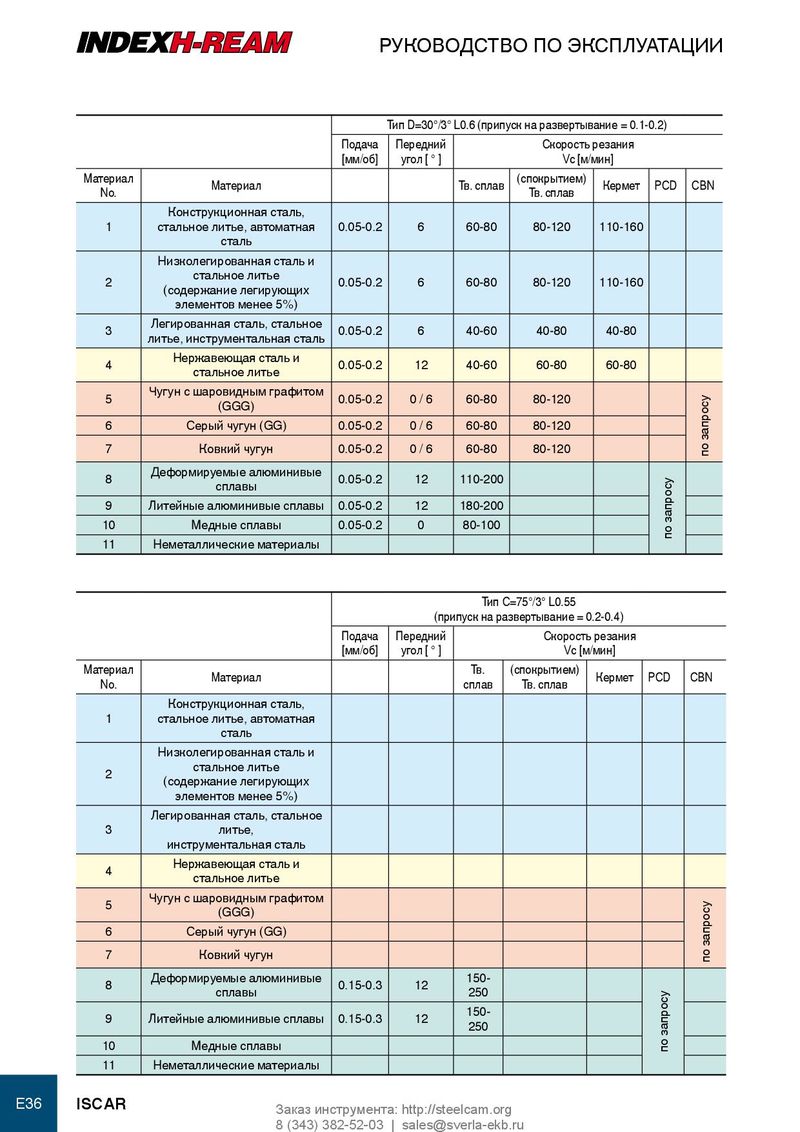 РУКОВОДСТВО ПО ЭКСПЛУАТАЦИИ Тип D=30°/3° L0.6 (припуск на развертывание = 0.1-0.2) Подача Передний Скорость резания [мм/об] угол [ ° ] Vc [м/мин] Материал (спокрытием) Материал Тв. сплав Кермет PCD CBN No. Тв. сплав Конструкционная сталь, 1 стальное литье, автоматная 0.05-0.2 6 60-80 80-120 110-160 сталь Низколегированная сталь и стальное литье 2 0.05-0.2 6 60-80 80-120 110-160 (содержание легирующих элементов менее 5%) Легированная сталь, стальное 3 0.05-0.2 6 40-60 40-80 40-80 литье, инструментальная сталь Нержавеющая сталь и 4 0.05-0.2 12 40-60 60-80 60-80 стальное литье Чугун с шаровидным графитом 5 0.05-0.2 0 / 6 60-80 80-120 (GGG) 6 Серый чугун (GG) 0.05-0.2 0 / 6 60-80 80-120 7 Ковкий чугун 0.05-0.2 0 / 6 60-80 80-120 по запросу Деформируемые алюминивые 8 0.05-0.2 12 110-200 сплавы 9 Литейные алюминивые сплавы 0.05-0.2 12 180-200 10 Медные сплавы 0.05-0.2 0 80-100 по запросу 11 Неметаллические материалы Тип C=75°/3° L0.55 (припуск на развертывание = 0.2-0.4) Подача Передний Скорость резания [мм/об] угол [ ° ] Vc [м/мин] Материал Тв. (спокрытием) Материал Кермет PCD CBN No. сплав Тв. сплав Конструкционная сталь, 1 стальное литье, автоматная сталь Низколегированная сталь и стальное литье 2 (содержание легирующих элементов менее 5%) Легированная сталь, стальное 3 литье, инструментальная сталь Нержавеющая сталь и 4 стальное литье Чугун с шаровидным графитом 5 (GGG) 6 Серый чугун (GG) 7 Ковкий чугун по запросу Деформируемые алюминивые 150- 8 0.15-0.3 12 сплавы 250 150- 9 Литейные алюминивые сплавы 0.15-0.3 12 250 10 Медные сплавы по запросу 11 Неметаллические материалы E36 ISCAR Заказ инструмента: http://steelcam.org 8 (343) 382-52-03 | sales@sverla-ekb.ru