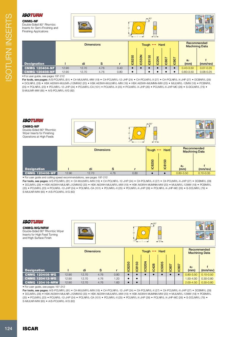 75° 95° 80° CNMG-NF 95° Double-Sided 80° Rhombic Inserts for Semi-Finishing and di 95º 75° Finishing Applications r l S Recommended Dimensions Tough 1 Hard Machining Data a p f Designation l di S r IC8250 IC530N IC8150 IC20N IC807 IC907 (mm) (mm/rev) CNMG 120404-NF 12.90 12.70 4.76 0.40 • • • • • • 0.40-3.50 0.07-0.25 CNMG 120408-NF 12.90 12.70 4.76 0.80 • • • • • 0.80-3.50 0.08-0.25 • For user guide, see pages 197-212 ISOTURN INSERTS For tools, see pages: A/S-PCLNR/L (81) • C#-MULNR/L-MW (19) • C#-PCLNR/L-12-JHP (24) • C#-PCLNR/L-X (27) • C#-PCLNR/L-X-JHP (27) • DCBNR/L (28) • DCLNR/L (28) • HSK A63WH-MULNR-J12MWX2 (20) • HSK A63WH-MULNR/L-MW (19) • HSK A63WH-MUMNN-MW (20) • MULNR/L-12MW (18) • PCBNR/L (25) • PCLNR/L (23) • PCLNR/L-12-JHP (24) • PCLNR/L-CA (101) • PCLNR/L-X (25) • PCLNR/L-X-JHP (26) • PCLNR/L-X-JHP-MC (26) • S-DCLNR/L (79) • S-MULNR-MW (85) • A/S-PCLNR/L-X/G (82) 75° 95° 80° CNMG-WF 95° Double-Sided 80° Rhombic Wiper Inserts for Finishing di 95º 75° Operations at High Feeds r l S Recommended Dimensions Tough 1 Hard Machining Data a p f Designation l di S r IC8250 IC8150 (mm) (mm/rev) CNMG 120408-WF 12.90 12.70 4.76 0.80 • • 0.80-3.50 0.10-0.35 • For user guide and cutting speed recommendations, see pages 197-212 For tools, see pages: A/S-PCLNR/L (81) • C#-MULNR/L-MW (19) • C#-PCLNR/L-12-JHP (24) • C#-PCLNR/L-X (27) • C#-PCLNR/L-X-JHP (27) • DCBNR/L (28) • DCLNR/L (28) • HSK A63WH-MULNR-J12MWX2 (20) • HSK A63WH-MULNR/L-MW (19) • HSK A63WH-MUMNN-MW (20) • MULNR/L-12MW (18) • PCBNR/L (25) • PCLNR/L (23) • PCLNR/L-12-JHP (24) • PCLNR/L-CA (101) • PCLNR/L-X (25) • PCLNR/L-X-JHP (26) • PCLNR/L-X-JHP-MC (26) • S-DCLNR/L (79) • S-MULNR-MW (85) • A/S-PCLNR/L-X/G (82) 80° 75° 95° CNMG-WG/NRW 95° Double-Sided 80° Rhombic Wiper di Inserts for High Feed Turning 95º 75° and High Surface Finish r l S Recommended Dimensions Tough 1 Hard Machining Data a p f Designation l di S r IC8250 IC8150 IC520N IC428 IC5005 IC807 IC907 (mm) (mm/rev) CNMG 120408-WG 12.90 12.70 4.76 0.80 • • • • • • • 0.80-3.50 0.10-0.50 CNMG 120412-WG 12.90 12.70 4.76 1.20 • • 1.50-4.00 0.30-0.80 CNMG 120416-NRW 12.90 12.70 4.76 1.60 • • 2.00-4.50 0.30-0.80 • For user guide, see pages 197-212 For tools, see pages: A/S-PCLNR/L (81) • C#-MULNR/L-MW (19) • C#-PCLNR/L-12-JHP (24) • C#-PCLNR/L-X (27) • C#-PCLNR/L-X-JHP (27) • DCBNR/L (28) • DCLNR/L (28) • HSK A63WH-MULNR-J12MWX2 (20) • HSK A63WH-MULNR/L-MW (19) • HSK A63WH-MUMNN-MW (20) • MULNR/L-12MW (18) • PCBNR/L (25) • PCLNR/L (23) • PCLNR/L-12-JHP (24) • PCLNR/L-CA (101) • PCLNR/L-X (25) • PCLNR/L-X-JHP (26) • PCLNR/L-X-JHP-MC (26) • S-DCLNR/L (79) • S-MULNR-MW (85) • A/S-PCLNR/L-X/G (82) 124 ISCAR