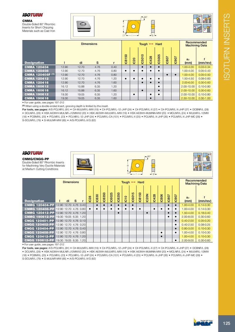 80° 75° 95° CNMA 95° Double-Sided 80° Rhombic di Inserts for Short Chipping 95º 75° Materials such as Cast Iron r l S Recommended Dimensions Tough 1 Hard Machining Data a p f Designation l di S r IC8150 IC20 IC5010 IC428 IC5005 IC807 IC907 (mm) (mm/rev) CNMA 120404 12.90 12.70 4.76 0.40 • • • 1.00-4.00 0.03-0.34 CNMA 120408 12.90 12.70 4.76 0.80 • • • • • 1.00-4.00 0.05-0.43 CNMA 120408F (1) 12.90 12.70 4.76 0.80 • • 1.00-4.00 0.05-0.50 CNMA 120412 12.90 12.70 4.76 1.20 • • • • • 1.50-4.50 0.08-0.60 ISOTURN INSERTS CNMA 120416 12.90 12.70 4.76 1.60 • • • 2.00-6.00 0.30-0.60 CNMA 160612 16.12 15.88 6.35 1.20 • 2.00-10.00 0.10-0.80 CNMA 160616 16.12 15.88 6.35 1.60 • • 2.00-10.00 0.30-0.60 CNMA 190612 19.30 19.05 6.35 1.20 • • • 2.00-10.00 0.10-0.80 CNMA 190616 19.30 19.05 6.35 1.60 • 2.50-10.00 0.30-1.00 • For user guide, see pages 197-212 (1) When using a double-ended insert, grooving depth is limited by the insert. For tools, see pages: A/S-PCLNR/L (81) • C#-MULNR/L-MW (19) • C#-PCLNR/L-12-JHP (24) • C#-PCLNR/L-X (27) • C#-PCLNR/L-X-JHP (27) • DCBNR/L (28) • DCLNR/L (28) • HSK A63WH-MULNR-J12MWX2 (20) • HSK A63WH-MULNR/L-MW (19) • HSK A63WH-MUMNN-MW (20) • MCLNR/L (24) • MULNR/L-12MW (18) • PCBNR/L (25) • PCLNR/L (23) • PCLNR/L-12-JHP (24) • PCLNR/L-CA (101) • PCLNR/L-X (25) • PCLNR/L-X-JHP (26) • PCLNR/L-X-JHP-MC (26) • S-DCLNR/L (79) • S-MULNR-MW (85) • A/S-PCLNR/L-X/G (82) 75° 80° 75° CNMG/CNGG-PP Double-Sided 80° Rhombic Inserts 95° for Machining Very Ductile Materials di 95º at Medium Cutting Conditions 95° r l S Recommended Dimensions Tough 1 Hard Machining Data a p f Designation l di S r IC28 IC830 IC8350 IC6025 IC8250 IC10 IC6015 IC8150 IC20N IC428 IC806 IC807 IC907 (mm) (mm/rev) CNMG 120404-PP 12.90 12.70 4.76 0.40 • • • • • • • • 1.00-4.00 0.14-0.30 CNMG 120408-PP 12.90 12.70 4.76 0.80 • • • • • • • • • • • • 1.00-4.00 0.14-0.30 CNMG 120412-PP 12.90 12.70 4.76 1.20 • • • • 1.50-4.00 0.18-0.40 CNMG 190612-PP 19.30 19.05 6.35 1.20 • • 2.00-8.00 0.30-0.60 CNGG 120401-PP 12.90 12.70 4.76 0.10 • 0.40-2.00 0.05-0.20 CNGG 120402-PP 12.90 12.70 4.76 0.20 • 0.40-2.50 0.08-0.25 CNGG 120404-PP 12.90 12.70 4.76 0.40 • 0.80-3.00 0.10-0.30 CNGG 120408-PP 12.90 12.70 4.76 0.80 • • 1.00-4.00 0.10-0.30 CNGG 120412-PP 12.90 12.70 4.76 1.20 • 1.00-4.00 0.10-0.30 CNGG 190612-PP 19.30 19.05 6.35 1.20 • 2.00-9.00 0.30-0.60 • For user guide, see pages 197-212 For tools, see pages: A/S-PCLNR/L (81) • C#-MULNR/L-MW (19) • C#-PCLNR/L-12-JHP (24) • C#-PCLNR/L-X (27) • C#-PCLNR/L-X-JHP (27) • DCBNR/L (28) • DCLNR/L (28) • HSK A63WH-MULNR-J12MWX2 (20) • HSK A63WH-MULNR/L-MW (19) • HSK A63WH-MUMNN-MW (20) • MCLNR/L (24) • MULNR/L-12MW (18) • PCBNR/L (25) • PCLNR/L (23) • PCLNR/L-12-JHP (24) • PCLNR/L-CA (101) • PCLNR/L-X (25) • PCLNR/L-X-JHP (26) • PCLNR/L-X-JHP-MC (26) • S-DCLNR/L (79) • S-MULNR-MW (85) • A/S-PCLNR/L-X/G (82) 125