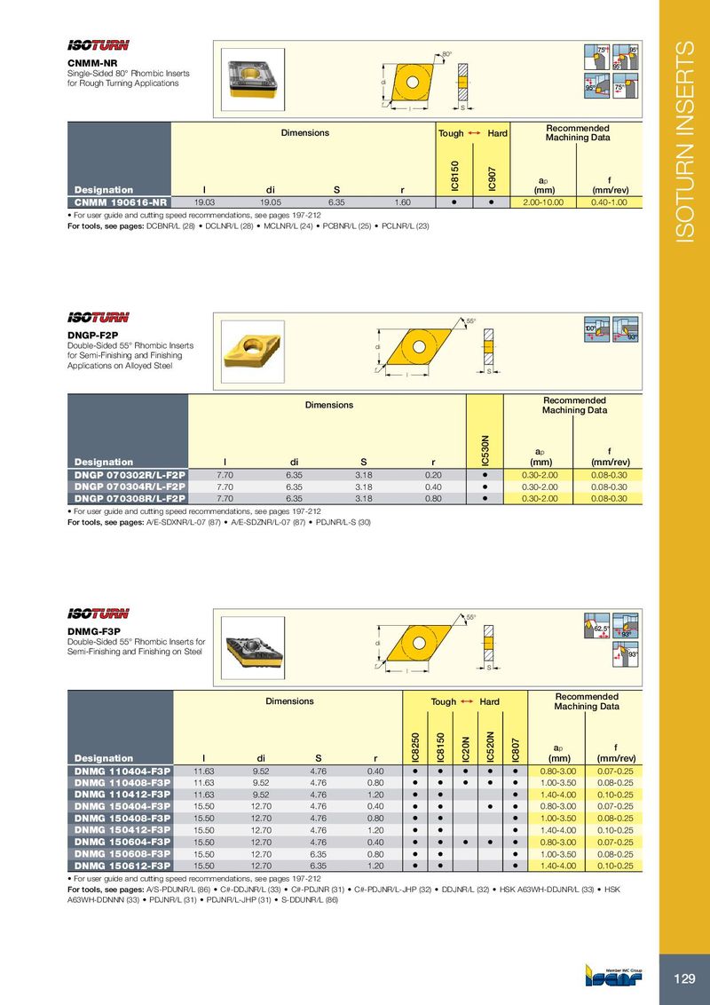 75° 95° 80° CNMM-NR 95° Single-Sided 80° Rhombic Inserts for Rough Turning Applications di 95º 75° r l S Recommended Dimensions Tough 1 Hard Machining Data a p f Designation l di S r IC8150 IC907 (mm) (mm/rev) CNMM 190616-NR 19.03 19.05 6.35 1.60 • • 2.00-10.00 0.40-1.00 • For user guide and cutting speed recommendations, see pages 197-212 For tools, see pages: DCBNR/L (28) • DCLNR/L (28) • MCLNR/L (24) • PCBNR/L (25) • PCLNR/L (23) ISOTURN INSERTS 55° 100º DNGP-F2P 93º Double-Sided 55° Rhombic Inserts di for Semi-Finishing and Finishing Applications on Alloyed Steel r S l Recommended Dimensions Machining Data a p f Designation l di S r IC530N (mm) (mm/rev) DNGP 070302R/L-F2P 7.70 6.35 3.18 0.20 • 0.30-2.00 0.08-0.30 DNGP 070304R/L-F2P 7.70 6.35 3.18 0.40 • 0.30-2.00 0.08-0.30 DNGP 070308R/L-F2P 7.70 6.35 3.18 0.80 • 0.30-2.00 0.08-0.30 • For user guide and cutting speed recommendations, see pages 197-212 For tools, see pages: A/E-SDXNR/L-07 (87) • A/E-SDZNR/L-07 (87) • PDJNR/L-S (30) 55° 62.5° DNMG-F3P 93º Double-Sided 55° Rhombic Inserts for di Semi-Finishing and Finishing on Steel 93° r S l Recommended Dimensions Tough 1 Hard Machining Data a p f Designation l di S r IC8250 IC8150 IC20N IC520N IC807 (mm) (mm/rev) DNMG 110404-F3P 11.63 9.52 4.76 0.40 • • • • • 0.80-3.00 0.07-0.25 DNMG 110408-F3P 11.63 9.52 4.76 0.80 • • • • • 1.00-3.50 0.08-0.25 DNMG 110412-F3P 11.63 9.52 4.76 1.20 • • • 1.40-4.00 0.10-0.25 DNMG 150404-F3P 15.50 12.70 4.76 0.40 • • • • 0.80-3.00 0.07-0.25 DNMG 150408-F3P 15.50 12.70 4.76 0.80 • • • 1.00-3.50 0.08-0.25 DNMG 150412-F3P 15.50 12.70 4.76 1.20 • • • 1.40-4.00 0.10-0.25 DNMG 150604-F3P 15.50 12.70 4.76 0.40 • • • • • 0.80-3.00 0.07-0.25 DNMG 150608-F3P 15.50 12.70 6.35 0.80 • • • 1.00-3.50 0.08-0.25 DNMG 150612-F3P 15.50 12.70 6.35 1.20 • • • 1.40-4.00 0.10-0.25 • For user guide and cutting speed recommendations, see pages 197-212 For tools, see pages: A/S-PDUNR/L (86) • C#-DDJNR/L (33) • C#-PDJNR (31) • C#-PDJNR/L-JHP (32) • DDJNR/L (32) • HSK A63WH-DDJNR/L (33) • HSK A63WH-DDNNN (33) • PDJNR/L (31) • PDJNR/L-JHP (31) • S-DDUNR/L (86) 129