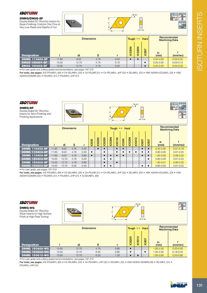 55° 62.5° 93° DNMG/DNGG-SF Double-Sided 55° Rhombic Inserts for di Super-Finishing; Controls Chip Flow at Very Low Feeds and Depths of Cut 93º r S l Recommended Dimensions Tough 1 Hard Machining Data a p f Designation l di S r IC530N IC520N IC907 (mm) (mm/rev) DNMG 110404-SF 11.63 9.52 4.76 0.40 • • 0.50-3.00 0.05-0.25 DNGG 150401-SF 15.50 12.70 4.76 0.10 • 0.25-2.00 0.03-0.15 DNGG 150402-SF 15.50 12.70 4.76 0.20 • 0.40-2.50 0.05-0.20 • For user guide and cutting speed recommendations, see pages 197-212 ISOTURN INSERTS For tools, see pages: A/S-PDUNR/L (86) • C#-DDJNR/L (33) • C#-PDJNR (31) • C#-PDJNR/L-JHP (32) • DDJNR/L (32) • HSK A63WH-DDJNR/L (33) • HSK A63WH-DDNNN (33) • PDJNR/L (31) • PDJNR/L-JHP (31) 55° 62.5° DNMG-NF 93º Double-Sided 55° Rhombic di Inserts for Semi-Finishing and 93° Finishing Applications r l S Recommended Dimensions Tough 1 Hard Machining Data a p f Designation l di S r IC830 IC8350 IC8250 IC530N IC8150 IC20N IC520N IC5010 IC807 IC907 (mm) (mm/rev) DNMG 110402-NF 11.63 9.52 4.76 0.20 • • • • • • 0.40-2.50 0.07-0.18 DNMG 110404-NF 11.63 9.52 4.76 0.40 • • • • • • • • 0.80-3.00 0.07-0.25 DNMG 110408-NF 11.63 9.52 4.76 0.80 • • • • • • • 1.00-3.50 0.08-0.25 DNMG 150404-NF 15.50 12.70 4.76 0.40 • • • 0.80-3.50 0.07-0.25 DNMG 150408-NF 15.50 12.70 4.76 0.80 • • 1.00-3.51 0.08-0.25 DNMG 150604-NF 15.50 12.70 6.35 0.40 • • • • 0.80-3.50 0.07-0.25 • For user guide, see pages 197-212 For tools, see pages: A/S-PDUNR/L (86) • C#-DDJNR/L (33) • C#-PDJNR (31) • C#-PDJNR/L-JHP (32) • DDJNR/L (32) • HSK A63WH-DDJNR/L (33) • HSK A63WH-DDNNN (33) • PDJNR/L (31) • PDJNR/L-JHP (31) • S-DDUNR/L (86) 55° 93° DNMG-WG Double-Sided 55° Rhombic di Wiper Inserts for High Surface Finish at High Feed Turning r l S Recommended Dimensions Tough 1 Hard Machining Data a p f Designation l di S r IC8250 IC5010 IC807 (mm) (mm/rev) DNMG 150408-WG 15.50 12.70 4.76 0.80 • 1.00-2.50 0.20-0.50 DNMG 150608-WG 15.50 12.70 6.35 0.80 • • 1.00-2.50 0.18-0.40 DNMG 150612-WG 15.50 12.70 6.35 1.20 • • 1.00-3.00 0.20-0.80 • For user guide and cutting speed recommendations, see pages 197-212 For tools, see pages: A/S-PDUNR/L (86) • C#-DDJNR/L (33) • C#-PDJNR/L-JHP (32) • DDJNR/L (32) • HSK A63WH-DDNNN (33) • PDJNR/L (31) • PDJNR/L-JHP (31) 131