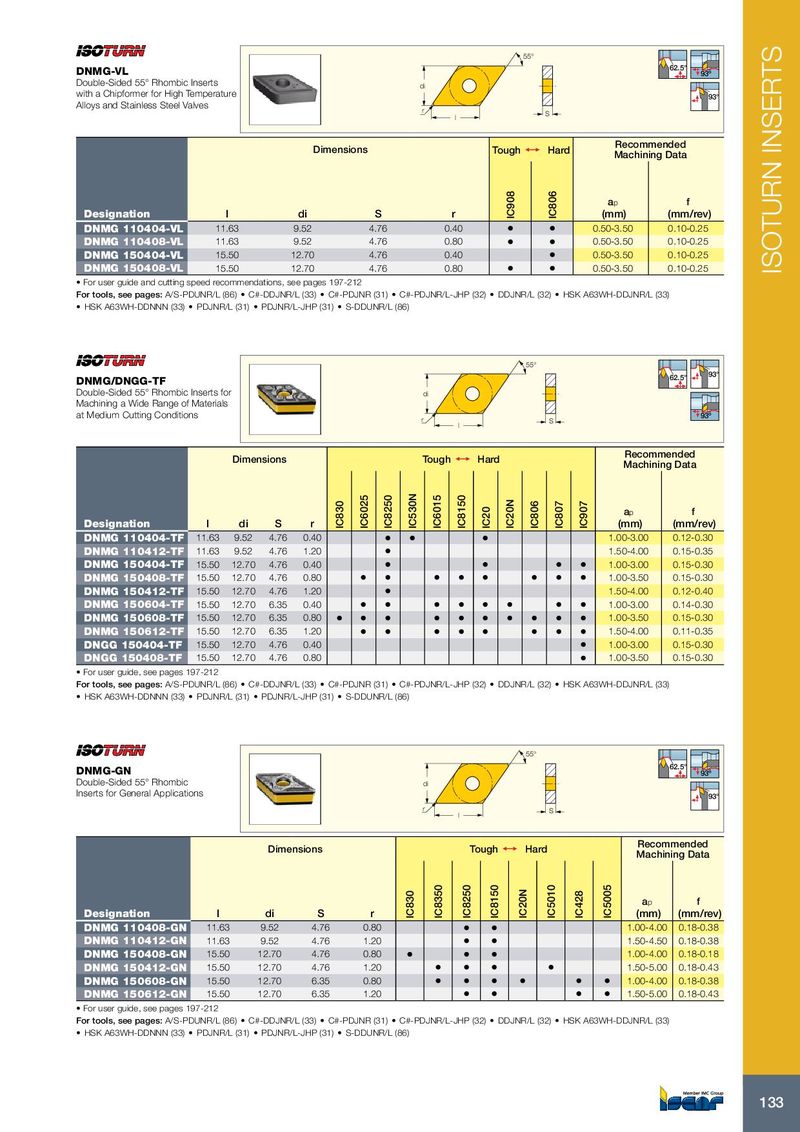 55° 62.5° DNMG-VL 93º Double-Sided 55° Rhombic Inserts di with a Chipformer for High Temperature 93° Alloys and Stainless Steel Valves r l S Recommended Dimensions Tough 1 Hard Machining Data a p f Designation l di S r IC908 IC806 (mm) (mm/rev) DNMG 110404-VL 11.63 9.52 4.76 0.40 • • 0.50-3.50 0.10-0.25 DNMG 110408-VL 11.63 9.52 4.76 0.80 • • 0.50-3.50 0.10-0.25 DNMG 150404-VL 15.50 12.70 4.76 0.40 • 0.50-3.50 0.10-0.25 DNMG 150408-VL 15.50 12.70 4.76 0.80 • • 0.50-3.50 0.10-0.25 ISOTURN INSERTS • For user guide and cutting speed recommendations, see pages 197-212 For tools, see pages: A/S-PDUNR/L (86) • C#-DDJNR/L (33) • C#-PDJNR (31) • C#-PDJNR/L-JHP (32) • DDJNR/L (32) • HSK A63WH-DDJNR/L (33) • HSK A63WH-DDNNN (33) • PDJNR/L (31) • PDJNR/L-JHP (31) • S-DDUNR/L (86) 55° 62.5° 93° DNMG/DNGG-TF Double-Sided 55° Rhombic Inserts for di Machining a Wide Range of Materials at Medium Cutting Conditions r 93º S l Recommended Dimensions Tough 1 Hard Machining Data a p f Designation l di S r IC830 IC6025 IC8250 IC530N IC6015 IC8150 IC20 IC20N IC806 IC807 IC907 (mm) (mm/rev) DNMG 110404-TF 11.63 9.52 4.76 0.40 • • • 1.00-3.00 0.12-0.30 DNMG 110412-TF 11.63 9.52 4.76 1.20 • 1.50-4.00 0.15-0.35 DNMG 150404-TF 15.50 12.70 4.76 0.40 • • • • 1.00-3.00 0.15-0.30 DNMG 150408-TF 15.50 12.70 4.76 0.80 • • • • • • • • 1.00-3.50 0.15-0.30 DNMG 150412-TF 15.50 12.70 4.76 1.20 • 1.50-4.00 0.12-0.40 DNMG 150604-TF 15.50 12.70 6.35 0.40 • • • • • • • • 1.00-3.00 0.14-0.30 DNMG 150608-TF 15.50 12.70 6.35 0.80 • • • • • • • • • • 1.00-3.50 0.15-0.30 DNMG 150612-TF 15.50 12.70 6.35 1.20 • • • • • • • • 1.50-4.00 0.11-0.35 DNGG 150404-TF 15.50 12.70 4.76 0.40 • 1.00-3.00 0.15-0.30 DNGG 150408-TF 15.50 12.70 4.76 0.80 • 1.00-3.50 0.15-0.30 • For user guide, see pages 197-212 For tools, see pages: A/S-PDUNR/L (86) • C#-DDJNR/L (33) • C#-PDJNR (31) • C#-PDJNR/L-JHP (32) • DDJNR/L (32) • HSK A63WH-DDJNR/L (33) • HSK A63WH-DDNNN (33) • PDJNR/L (31) • PDJNR/L-JHP (31) • S-DDUNR/L (86) 55° 62.5° DNMG-GN 93º Double-Sided 55° Rhombic di Inserts for General Applications 93° r S l Recommended Dimensions Tough 1 Hard Machining Data a p f Designation l di S r IC830 IC8350 IC8250 IC8150 IC20N IC5010 IC428 IC5005 (mm) (mm/rev) DNMG 110408-GN 11.63 9.52 4.76 0.80 • • 1.00-4.00 0.18-0.38 DNMG 110412-GN 11.63 9.52 4.76 1.20 • • 1.50-4.50 0.18-0.38 DNMG 150408-GN 15.50 12.70 4.76 0.80 • • • 1.00-4.00 0.18-0.18 DNMG 150412-GN 15.50 12.70 4.76 1.20 • • • • 1.50-5.00 0.18-0.43 DNMG 150608-GN 15.50 12.70 6.35 0.80 • • • • • • 1.00-4.00 0.18-0.38 DNMG 150612-GN 15.50 12.70 6.35 1.20 • • • • 1.50-5.00 0.18-0.43 • For user guide, see pages 197-212 For tools, see pages: A/S-PDUNR/L (86) • C#-DDJNR/L (33) • C#-PDJNR (31) • C#-PDJNR/L-JHP (32) • DDJNR/L (32) • HSK A63WH-DDJNR/L (33) • HSK A63WH-DDNNN (33) • PDJNR/L (31) • PDJNR/L-JHP (31) • S-DDUNR/L (86) 133
