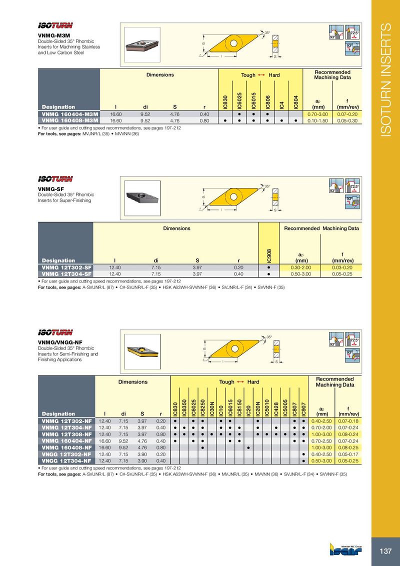 35° 72.5° VNMG-M3M 93° Double-Sided 35° Rhombic di Inserts for Machining Stainless 93º and Low Carbon Steel r l S Recommended Dimensions Tough 1 Hard Machining Data a p f Designation l di S r IC830 IC6025 IC6015 IC806 IC4 IC804 (mm) (mm/rev) VNMG 160404-M3M 16.60 9.52 4.76 0.40 • • • 0.70-3.00 0.07-0.20 VNMG 160408-M3M 16.60 9.52 4.76 0.80 • • • • • • 0.10-1.50 0.05-0.30 • For user guide and cutting speed recommendations, see pages 197-212 For tools, see pages: MVJNR/L (35) • MVVNN (36) ISOTURN INSERTS 35° 72.5° VNMG-SF 93° Double-Sided 35° Rhombic di Inserts for Super-Finishing 93º r l S Dimensions Recommended Machining Data a p f Designation l di S r IC908 (mm) (mm/rev) VNMG 12T302-SF 12.40 7.15 3.97 0.20 • 0.30-2.00 0.03-0.20 VNMG 12T304-SF 12.40 7.15 3.97 0.40 • 0.50-3.00 0.05-0.25 • For user guide and cutting speed recommendations, see pages 197-212 For tools, see pages: A-SVUNR/L (87) • C#-SVJNR/L-F (35) • HSK A63WH-SVVNN-F (36) • SVJNR/L-F (34) • SVVNN-F (35) 35° 72.5° VNMG/VNGG-NF 93° Double-Sided 35° Rhombic di Inserts for Semi-Finishing and 93º Finishing Applications r l S Recommended Dimensions Tough 1 Hard Machining Data a p f Designation l di S r IC830 IC8350 IC6025 IC8250 IC30N IC10 IC6015 IC8150 IC20 IC20N IC5010 IC428 IC5005 IC807 IC907 (mm) (mm/rev) VNMG 12T302-NF 12.40 7.15 3.97 0.20 • • • • • • • • 0.40-2.50 0.07-0.18 VNMG 12T304-NF 12.40 7.15 3.97 0.40 • • • • • • • • • • • 0.70-2.00 0.07-0.24 VNMG 12T308-NF 12.40 7.15 3.97 0.80 • • • • • • • • • • • • • • 1.00-3.00 0.08-0.24 VNMG 160404-NF 16.60 9.52 4.76 0.40 • • • • • • • 0.70-2.50 0.07-0.24 VNMG 160408-NF 16.60 9.52 4.76 0.80 • • 1.00-3.00 0.08-0.25 VNGG 12T302-NF 12.40 7.15 3.90 0.20 • 0.40-2.50 0.05-0.17 VNGG 12T304-NF 12.40 7.15 3.90 0.40 • 0.50-3.00 0.05-0.25 • For user guide and cutting speed recommendations, see pages 197-212 For tools, see pages: A-SVUNR/L (87) • C#-SVJNR/L-F (35) • HSK A63WH-SVVNN-F (36) • MVJNR/L (35) • MVVNN (36) • SVJNR/L-F (34) • SVVNN-F (35) 137