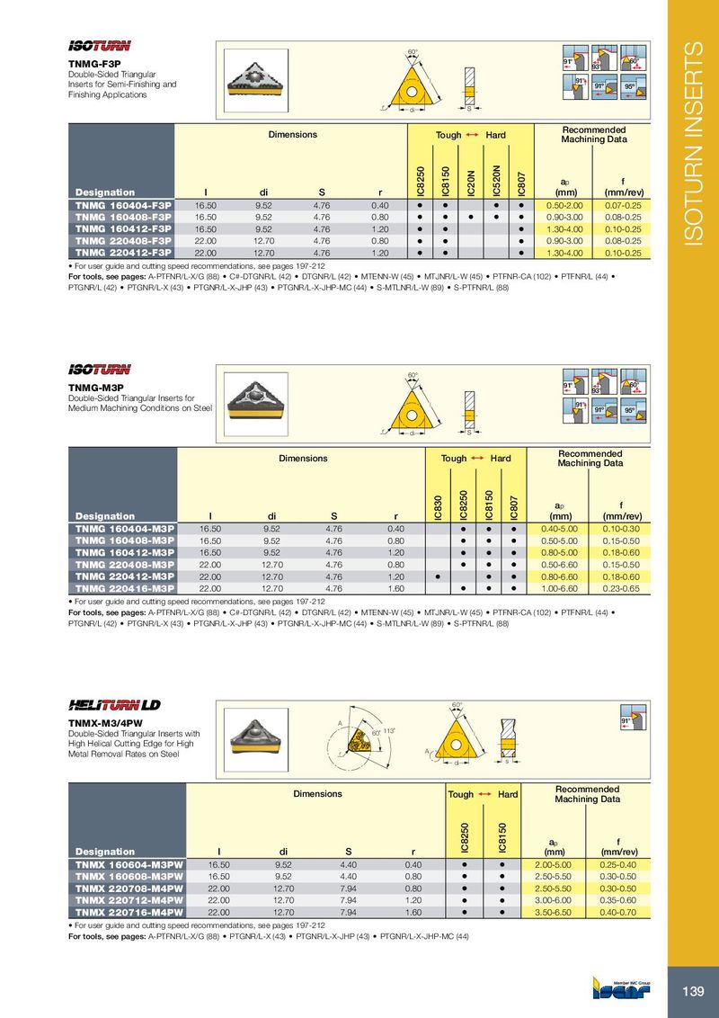 60° 91° 60° TNMG-F3P 93° Double-Sided Triangular l 91° Inserts for Semi-Finishing and 91º 95º Finishing Applications r di S Recommended Dimensions Tough 1 Hard Machining Data a p f Designation l di S r IC8250 IC8150 IC20N IC520N IC807 (mm) (mm/rev) TNMG 160404-F3P 16.50 9.52 4.76 0.40 • • • • 0.50-2.00 0.07-0.25 TNMG 160408-F3P 16.50 9.52 4.76 0.80 • • • • • 0.90-3.00 0.08-0.25 TNMG 160412-F3P 16.50 9.52 4.76 1.20 • • • 1.30-4.00 0.10-0.25 TNMG 220408-F3P 22.00 12.70 4.76 0.80 • • • 0.90-3.00 0.08-0.25 ISOTURN INSERTS TNMG 220412-F3P 22.00 12.70 4.76 1.20 • • • 1.30-4.00 0.10-0.25 • For user guide and cutting speed recommendations, see pages 197-212 For tools, see pages: A-PTFNR/L-X/G (88) • C#-DTGNR/L (42) • DTGNR/L (42) • MTENN-W (45) • MTJNR/L-W (45) • PTFNR-CA (102) • PTFNR/L (44) • PTGNR/L (42) • PTGNR/L-X (43) • PTGNR/L-X-JHP (43) • PTGNR/L-X-JHP-MC (44) • S-MTLNR/L-W (89) • S-PTFNR/L (88) 60° 91° 60° TNMG-M3P 93° Double-Sided Triangular Inserts for l 91° Medium Machining Conditions on Steel 91º 95º r di S Recommended Dimensions Tough 1 Hard Machining Data a p f Designation l di S r IC830 IC8250 IC8150 IC807 (mm) (mm/rev) TNMG 160404-M3P 16.50 9.52 4.76 0.40 • • • 0.40-5.00 0.10-0.30 TNMG 160408-M3P 16.50 9.52 4.76 0.80 • • • 0.50-5.00 0.15-0.50 TNMG 160412-M3P 16.50 9.52 4.76 1.20 • • • 0.80-5.00 0.18-0.60 TNMG 220408-M3P 22.00 12.70 4.76 0.80 • • • 0.50-6.60 0.15-0.50 TNMG 220412-M3P 22.00 12.70 4.76 1.20 • • • 0.80-6.60 0.18-0.60 TNMG 220416-M3P 22.00 12.70 4.76 1.60 • • • 1.00-6.60 0.23-0.65 • For user guide and cutting speed recommendations, see pages 197-212 For tools, see pages: A-PTFNR/L-X/G (88) • C#-DTGNR/L (42) • DTGNR/L (42) • MTENN-W (45) • MTJNR/L-W (45) • PTFNR-CA (102) • PTFNR/L (44) • PTGNR/L (42) • PTGNR/L-X (43) • PTGNR/L-X-JHP (43) • PTGNR/L-X-JHP-MC (44) • S-MTLNR/L-W (89) • S-PTFNR/L (88) 60° TNMX-M3/4PW A 91° Double-Sided Triangular Inserts with 60˚ 113˚ l High Helical Cutting Edge for High Metal Removal Rates on Steel r A di s Recommended Dimensions Tough 1 Hard Machining Data a p f Designation l di S r IC8250 IC8150 (mm) (mm/rev) TNMX 160604-M3PW 16.50 9.52 4.40 0.40 • • 2.00-5.00 0.25-0.40 TNMX 160608-M3PW 16.50 9.52 4.40 0.80 • • 2.50-5.50 0.30-0.50 TNMX 220708-M4PW 22.00 12.70 7.94 0.80 • • 2.50-5.50 0.30-0.50 TNMX 220712-M4PW 22.00 12.70 7.94 1.20 • • 3.00-6.00 0.35-0.60 TNMX 220716-M4PW 22.00 12.70 7.94 1.60 • • 3.50-6.50 0.40-0.70 • For user guide and cutting speed recommendations, see pages 197-212 For tools, see pages: A-PTFNR/L-X/G (88) • PTGNR/L-X (43) • PTGNR/L-X-JHP (43) • PTGNR/L-X-JHP-MC (44) 139