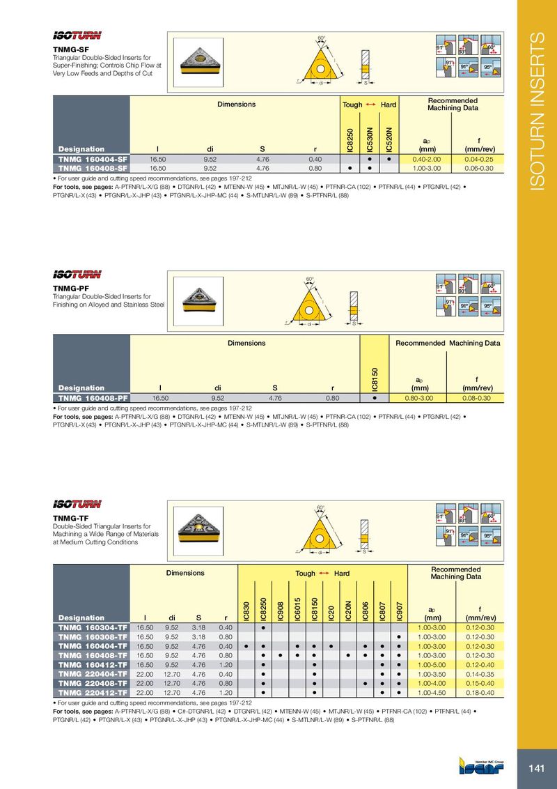 60° 91° 60° TNMG-SF 93° Triangular Double-Sided Inserts for l 91° Super-Finishing; Controls Chip Flow at 91º 95º Very Low Feeds and Depths of Cut r di S Recommended Dimensions Tough 1 Hard Machining Data a p f Designation l di S r IC8250 IC530N IC520N (mm) (mm/rev) TNMG 160404-SF 16.50 9.52 4.76 0.40 • • 0.40-2.00 0.04-0.25 TNMG 160408-SF 16.50 9.52 4.76 0.80 • • 1.00-3.00 0.06-0.30 • For user guide and cutting speed recommendations, see pages 197-212 For tools, see pages: A-PTFNR/L-X/G (88) • DTGNR/L (42) • MTENN-W (45) • MTJNR/L-W (45) • PTFNR-CA (102) • PTFNR/L (44) • PTGNR/L (42) • ISOTURN INSERTS PTGNR/L-X (43) • PTGNR/L-X-JHP (43) • PTGNR/L-X-JHP-MC (44) • S-MTLNR/L-W (89) • S-PTFNR/L (88) 60° 91° 60° TNMG-PF 93° Triangular Double-Sided Inserts for l 91° Finishing on Alloyed and Stainless Steel 91º 95º r di S Dimensions Recommended Machining Data a p f Designation l di S r IC8150 (mm) (mm/rev) TNMG 160408-PF 16.50 9.52 4.76 0.80 • 0.80-3.00 0.08-0.30 • For user guide and cutting speed recommendations, see pages 197-212 For tools, see pages: A-PTFNR/L-X/G (88) • DTGNR/L (42) • MTENN-W (45) • MTJNR/L-W (45) • PTFNR-CA (102) • PTFNR/L (44) • PTGNR/L (42) • PTGNR/L-X (43) • PTGNR/L-X-JHP (43) • PTGNR/L-X-JHP-MC (44) • S-MTLNR/L-W (89) • S-PTFNR/L (88) 60° 91° 60° TNMG-TF 93° Double-Sided Triangular Inserts for l 91° Machining a Wide Range of Materials 91º 95º at Medium Cutting Conditions r di S Recommended Dimensions Tough 1 Hard Machining Data a p f Designation l di S r IC830 IC8250 IC908 IC6015 IC8150 IC20 IC20N IC806 IC807 IC907 (mm) (mm/rev) TNMG 160304-TF 16.50 9.52 3.18 0.40 • 1.00-3.00 0.12-0.30 TNMG 160308-TF 16.50 9.52 3.18 0.80 • 1.00-3.00 0.12-0.30 TNMG 160404-TF 16.50 9.52 4.76 0.40 • • • • • • • • 1.00-3.00 0.12-0.30 TNMG 160408-TF 16.50 9.52 4.76 0.80 • • • • • • • • 1.00-3.00 0.12-0.30 TNMG 160412-TF 16.50 9.52 4.76 1.20 • • • • 1.00-5.00 0.12-0.40 TNMG 220404-TF 22.00 12.70 4.76 0.40 • • • • 1.00-3.50 0.14-0.35 TNMG 220408-TF 22.00 12.70 4.76 0.80 • • • • • 1.00-4.00 0.15-0.40 TNMG 220412-TF 22.00 12.70 4.76 1.20 • • • • 1.00-4.50 0.18-0.40 • For user guide and cutting speed recommendations, see pages 197-212 For tools, see pages: A-PTFNR/L-X/G (88) • C#-DTGNR/L (42) • DTGNR/L (42) • MTENN-W (45) • MTJNR/L-W (45) • PTFNR-CA (102) • PTFNR/L (44) • PTGNR/L (42) • PTGNR/L-X (43) • PTGNR/L-X-JHP (43) • PTGNR/L-X-JHP-MC (44) • S-MTLNR/L-W (89) • S-PTFNR/L (88) 141