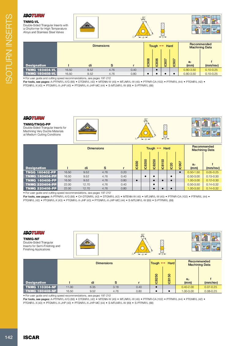60° 91° 60° TNMG-VL 93° Double-Sided Triangular Inserts with l 91° a Chipformer for High Temperature 91º 95º Alloys and Stainless Steel Valves r di S Recommended Dimensions Tough 1 Hard Machining Data a p f Designation l di S r IC908 IC806 IC807 IC907 (mm) (mm/rev) TNMG 160404-VL 16.50 9.52 4.76 0.40 • 0.80-3.50 0.10-0.25 TNMG 160408-VL 16.50 9.52 4.76 0.80 • • • • 0.80-3.50 0.10-0.25 • For user guide and cutting speed recommendations, see pages 197-212 ISOTURN INSERTS For tools, see pages: A-PTFNR/L-X/G (88) • DTGNR/L (42) • MTENN-W (45) • MTJNR/L-W (45) • PTFNR-CA (102) • PTFNR/L (44) • PTGNR/L (42) • PTGNR/L-X (43) • PTGNR/L-X-JHP (43) • PTGNR/L-X-JHP-MC (44) • S-MTLNR/L-W (89) • S-PTFNR/L (88) 60° 91° 60° TNMG/TNGG-PP 93° Double-Sided Triangular Inserts for l 91° Machining Very Ductile Materials 91º 95º at Medium Cutting Conditions r di S Recommended Dimensions Tough 1 Hard Machining Data a p f Designation l di S r IC830 IC8350 IC8250 IC8150 IC20 IC907 (mm) (mm/rev) TNGG 160402-PP 16.50 9.52 4.76 0.20 • 0.50-1.50 0.05-0.25 TNMG 160404-PP 16.50 9.52 4.76 0.40 • • • 0.50-3.00 0.13-0.30 TNMG 160408-PP 16.50 9.52 4.76 0.80 • • • • 1.00-3.00 0.12-0.30 TNMG 220404-PP 22.00 12.70 4.76 0.40 • 0.50-3.50 0.14-0.32 TNMG 220408-PP 22.00 12.70 4.76 0.80 • • • 1.00-3.50 0.14-0.32 • For user guide and cutting speed recommendations, see pages 197-212 For tools, see pages: A-PTFNR/L-X/G (88) • C#-DTGNR/L (42) • DTGNR/L (42) • MTENN-W (45) • MTJNR/L-W (45) • PTFNR-CA (102) • PTFNR/L (44) • PTGNR/L (42) • PTGNR/L-X (43) • PTGNR/L-X-JHP (43) • PTGNR/L-X-JHP-MC (44) • S-MTLNR/L-W (89) • S-PTFNR/L (88) 60° 91° 60° TNMG-NF 93° Double-Sided Triangular l 91° Inserts for Semi-Finishing and 91º 95º Finishing Applications r di S Recommended Dimensions Tough 1 Hard Machining Data a p f Designation l di S r IC8250 IC8150 (mm) (mm/rev) TNMG 110304-NF 11.00 6.35 3.18 0.40 • 0.40-2.00 0.07-0.25 TNMG 160408-NF 16.50 9.52 4.76 0.80 • • 1.00-3.00 0.08-0.25 • For user guide and cutting speed recommendations, see pages 197-212 For tools, see pages: A-PTFNR/L-X/G (88) • DTGNR/L (42) • MTENN-W (45) • MTJNR/L-W (45) • PTFNR-CA (102) • PTFNR/L (44) • PTGNR/L (42) • PTGNR/L-X (43) • PTGNR/L-X-JHP (43) • PTGNR/L-X-JHP-MC (44) • S-MTLNR/L-W (89) • S-PTFNR/L (88) 142 ISCAR