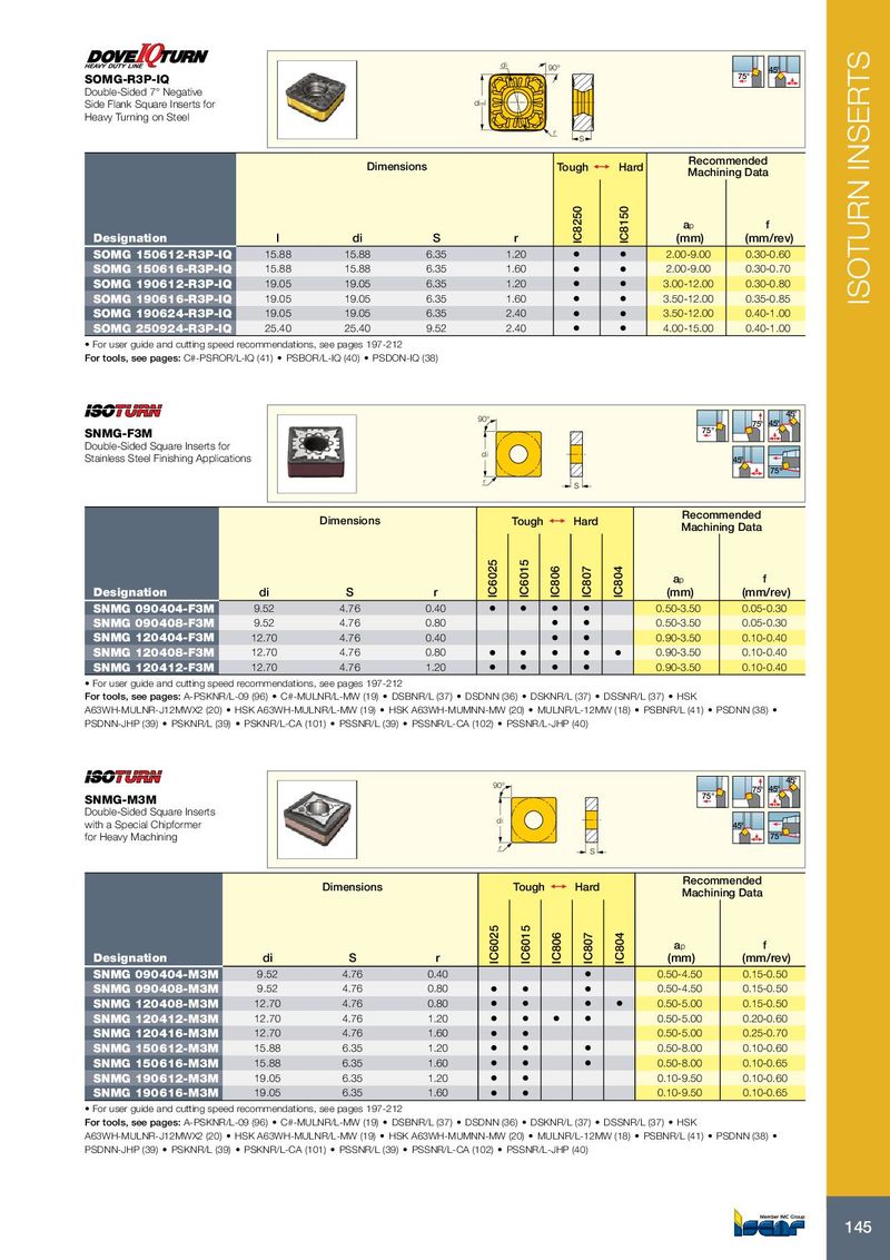 di 90° 45° 75° SOMG-R3P-IQ Double-Sided 7° Negative Side Flank Square Inserts for di=l Heavy Turning on Steel r S Recommended Dimensions Tough 1 Hard Machining Data a p f Designation l di S r IC8250 IC8150 (mm) (mm/rev) SOMG 150612-R3P-IQ 15.88 15.88 6.35 1.20 • • 2.00-9.00 0.30-0.60 SOMG 150616-R3P-IQ 15.88 15.88 6.35 1.60 • • 2.00-9.00 0.30-0.70 SOMG 190612-R3P-IQ 19.05 19.05 6.35 1.20 • • 3.00-12.00 0.30-0.80 SOMG 190616-R3P-IQ 19.05 19.05 6.35 1.60 • • 3.50-12.00 0.35-0.85 ISOTURN INSERTS SOMG 190624-R3P-IQ 19.05 19.05 6.35 2.40 • • 3.50-12.00 0.40-1.00 SOMG 250924-R3P-IQ 25.40 25.40 9.52 2.40 • • 4.00-15.00 0.40-1.00 • For user guide and cutting speed recommendations, see pages 197-212 For tools, see pages: C#-PSROR/L-IQ (41) • PSBOR/L-IQ (40) • PSDON-IQ (38) 45° 90° 75° 45° 75° SNMG-F3M Double-Sided Square Inserts for di Stainless Steel Finishing Applications 45° 75º r S Recommended Dimensions Tough 1 Hard Machining Data a p f Designation di S r IC6025 IC6015 IC806 IC807 IC804 (mm) (mm/rev) SNMG 090404-F3M 9.52 4.76 0.40 • • • • 0.50-3.50 0.05-0.30 SNMG 090408-F3M 9.52 4.76 0.80 • • 0.50-3.50 0.05-0.30 SNMG 120404-F3M 12.70 4.76 0.40 • • 0.90-3.50 0.10-0.40 SNMG 120408-F3M 12.70 4.76 0.80 • • • • • 0.90-3.50 0.10-0.40 SNMG 120412-F3M 12.70 4.76 1.20 • • • • 0.90-3.50 0.10-0.40 • For user guide and cutting speed recommendations, see pages 197-212 For tools, see pages: A-PSKNR/L-09 (96) • C#-MULNR/L-MW (19) • DSBNR/L (37) • DSDNN (36) • DSKNR/L (37) • DSSNR/L (37) • HSK A63WH-MULNR-J12MWX2 (20) • HSK A63WH-MULNR/L-MW (19) • HSK A63WH-MUMNN-MW (20) • MULNR/L-12MW (18) • PSBNR/L (41) • PSDNN (38) • PSDNN-JHP (39) • PSKNR/L (39) • PSKNR/L-CA (101) • PSSNR/L (39) • PSSNR/L-CA (102) • PSSNR/L-JHP (40) 45° 90° 75° 45° 75° SNMG-M3M Double-Sided Square Inserts di with a Special Chipformer 45° for Heavy Machining 75º r S Recommended Dimensions Tough 1 Hard Machining Data a p f Designation di S r IC6025 IC6015 IC806 IC807 IC804 (mm) (mm/rev) SNMG 090404-M3M 9.52 4.76 0.40 • 0.50-4.50 0.15-0.50 SNMG 090408-M3M 9.52 4.76 0.80 • • • 0.50-4.50 0.15-0.50 SNMG 120408-M3M 12.70 4.76 0.80 • • • • 0.50-5.00 0.15-0.50 SNMG 120412-M3M 12.70 4.76 1.20 • • • • 0.50-5.00 0.20-0.60 SNMG 120416-M3M 12.70 4.76 1.60 • • 0.50-5.00 0.25-0.70 SNMG 150612-M3M 15.88 6.35 1.20 • • • 0.50-8.00 0.10-0.60 SNMG 150616-M3M 15.88 6.35 1.60 • • • 0.50-8.00 0.10-0.65 SNMG 190612-M3M 19.05 6.35 1.20 • • 0.10-9.50 0.10-0.60 SNMG 190616-M3M 19.05 6.35 1.60 • • 0.10-9.50 0.10-0.65 • For user guide and cutting speed recommendations, see pages 197-212 For tools, see pages: A-PSKNR/L-09 (96) • C#-MULNR/L-MW (19) • DSBNR/L (37) • DSDNN (36) • DSKNR/L (37) • DSSNR/L (37) • HSK A63WH-MULNR-J12MWX2 (20) • HSK A63WH-MULNR/L-MW (19) • HSK A63WH-MUMNN-MW (20) • MULNR/L-12MW (18) • PSBNR/L (41) • PSDNN (38) • PSDNN-JHP (39) • PSKNR/L (39) • PSKNR/L-CA (101) • PSSNR/L (39) • PSSNR/L-CA (102) • PSSNR/L-JHP (40) 145
