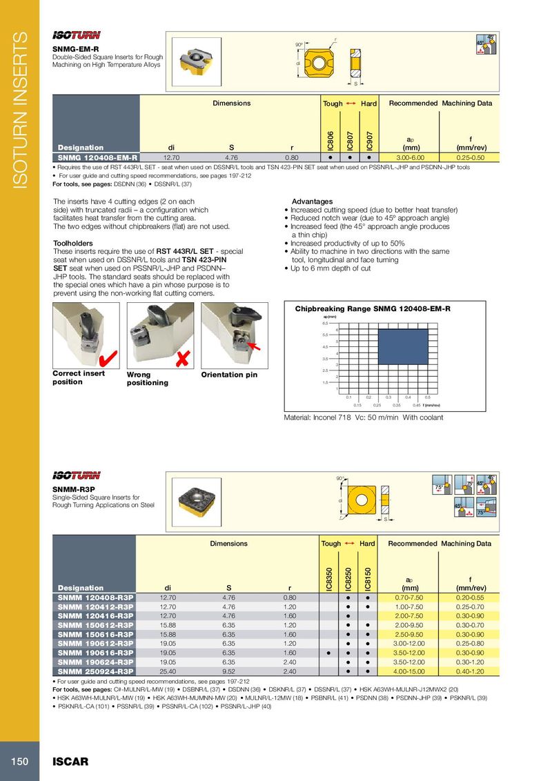 r 45° 90º 45° SNMG-EM-R Double-Sided Square Inserts for Rough Machining on High Temperature Alloys di S Dimensions Tough 1 Hard Recommended Machining Data a p f Designation di S r IC806 IC807 IC907 (mm) (mm/rev) SNMG 120408-EM-R 12.70 4.76 0.80 • • • 3.00-6.00 0.25-0.50 • Requires the use of RST 443R/L SET - seat when used on DSSNR/L tools and TSN 423-PIN SET seat when used on PSSNR/L-JHP and PSDNN-JHP tools • For user guide and cutting speed recommendations, see pages 197-212 For tools, see pages: DSDNN (36) • DSSNR/L (37) ISOTURN INSERTS The inserts have 4 cutting edges (2 on each Advantages side) with truncated radii – a configuration which • Increased cutting speed (due to better heat transfer) facilitates heat transfer from the cutting area. • Reduced notch wear (due to 45º approach angle) The two edges without chipbreakers (flat) are not used. • Increased feed (the 45° approach angle produces a thin chip) Toolholders • Increased productivity of up to 50% These inserts require the use of RST 443R/L SET - special • Ability to machine in two directions with the same seat when used on DSSNR/L tools and TSN 423-PIN tool, longitudinal and face turning SET seat when used on PSSNR/L-JHP and PSDNN– • Up to 6 mm depth of cut JHP tools. The standard seats should be replaced with the special ones which have a pin whose purpose is to prevent using the non-working flat cutting corners. Chipbreaking Range SNMG 120408-EM-R ap(mm) 6.5 6 5.5 5 4.5 4 3.5 3 2.5 Correct insert Wrong Orientation pin 2 position positioning 1.5 1 0.1 0.2 0.3 0.4 0.5 0.15 0.25 0.35 0.45 f (mm/rev) Material: Inconel 718 Vc: 50 m/min With coolant 90° 45° 75° 45° 75° SNMM-R3P Single-Sided Square Inserts for di Rough Turning Applications on Steel 45° 75º r S Dimensions Tough 1 Hard Recommended Machining Data a p f Designation di S r IC8350 IC8250 IC8150 (mm) (mm/rev) SNMM 120408-R3P 12.70 4.76 0.80 • • 0.70-7.50 0.20-0.55 SNMM 120412-R3P 12.70 4.76 1.20 • • 1.00-7.50 0.25-0.70 SNMM 120416-R3P 12.70 4.76 1.60 • 2.00-7.50 0.30-0.90 SNMM 150612-R3P 15.88 6.35 1.20 • • 2.00-9.50 0.30-0.70 SNMM 150616-R3P 15.88 6.35 1.60 • • 2.50-9.50 0.30-0.90 SNMM 190612-R3P 19.05 6.35 1.20 • • 3.00-12.00 0.25-0.80 SNMM 190616-R3P 19.05 6.35 1.60 • • • 3.50-12.00 0.30-0.90 SNMM 190624-R3P 19.05 6.35 2.40 • • 3.50-12.00 0.30-1.20 SNMM 250924-R3P 25.40 9.52 2.40 • • 4.00-15.00 0.40-1.20 • For user guide and cutting speed recommendations, see pages 197-212 For tools, see pages: C#-MULNR/L-MW (19) • DSBNR/L (37) • DSDNN (36) • DSKNR/L (37) • DSSNR/L (37) • HSK A63WH-MULNR-J12MWX2 (20) • HSK A63WH-MULNR/L-MW (19) • HSK A63WH-MUMNN-MW (20) • MULNR/L-12MW (18) • PSBNR/L (41) • PSDNN (38) • PSDNN-JHP (39) • PSKNR/L (39) • PSKNR/L-CA (101) • PSSNR/L (39) • PSSNR/L-CA (102) • PSSNR/L-JHP (40) 150 ISCAR
