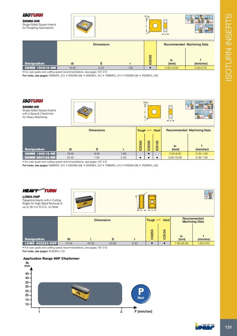90° 45° 45° 45° 75° SNMM-NM Single-Sided Square Inserts di for Roughing Applications 75° 75º r S Dimensions Recommended Machining Data a p f Designation di S r IC8250 (mm) (mm/rev) SNMM 190616-NM 19.05 6.35 1.60 • 2.50-10.00 0.30-0.70 • For user guide and cutting speed recommendations, see pages 197-212 For tools, see pages: DSBNR/L (37) • DSDNN (36) • DSSNR/L (37) • PSBNR/L (41) • PSDNN (38) • PSSNR/L (39) ISOTURN INSERTS 90° 45° 45° 75° SNMM-NR 75º Single-Sided Square Inserts di with a Special Chipformer 45° 75° for Heavy Machining r S Dimensions Tough 1 Hard Recommended Machining Data a p f Designation di S r IC8350 IC8250 IC8150 (mm) (mm/rev) SNMM 190616-NR 19.05 6.35 1.60 • 2.50-8.00 0.35-1.00 SNMM 250724-NR 25.40 7.94 2.40 • • • 5.00-15.00 0.35-1.00 • For user guide and cutting speed recommendations, see pages 197-212 For tools, see pages: DSBNR/L (37) • DSDNN (36) • DSSNR/L (37) • PSBNR/L (41) • PSDNN (38) • PSSNR/L (39) r LOMX-H6P 75° Tangential Inserts with 4 Cutting I Edges for High Metal Removal of up to 35 mm D.O.C. on Steel W S Recommended Dimensions Tough 1 Hard Machining Data a p f Designation W l S r IC8250 IC8150 (mm) (mm/rev) LOMX 402224-H6P 14.40 40.30 22.60 2.40 • • 7.00-35.00 1.00-2.00 • For user guide and cutting speed recommendations, see pages 197-212 For tools, see pages: PLBOR/L (10) Application Range H6P Chipformer ap mm 45 40 35 30 25 20 15 10 1 2 F (mm/rev) 151