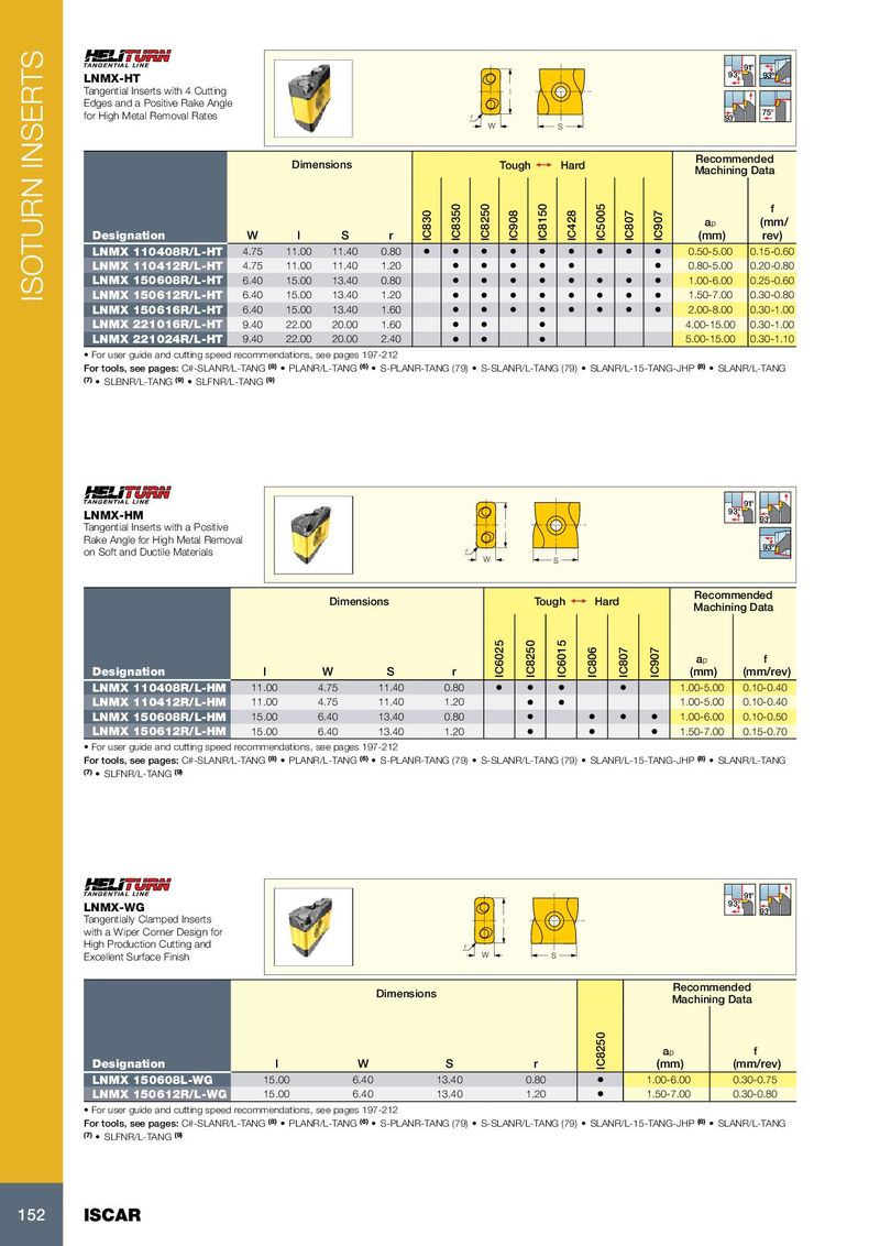91° 93° LNMX-HT 93º Tangential Inserts with 4 Cutting l Edges and a Positive Rake Angle for High Metal Removal Rates r 75° 93° W S Recommended Dimensions Tough 1 Hard Machining Data f a p (mm/ Designation W l S r IC830 IC8350 IC8250 IC908 IC8150 IC428 IC5005 IC807 IC907 (mm) rev) LNMX 110408R/L-HT 4.75 11.00 11.40 0.80 • • • • • • • • • 0.50-5.00 0.15-0.60 LNMX 110412R/L-HT 4.75 11.00 11.40 1.20 • • • • • • 0.80-5.00 0.20-0.80 LNMX 150608R/L-HT 6.40 15.00 13.40 0.80 • • • • • • • • 1.00-6.00 0.25-0.60 ISOTURN INSERTS LNMX 150612R/L-HT 6.40 15.00 13.40 1.20 • • • • • • • • 1.50-7.00 0.30-0.80 LNMX 150616R/L-HT 6.40 15.00 13.40 1.60 • • • • • • • • 2.00-8.00 0.30-1.00 LNMX 221016R/L-HT 9.40 22.00 20.00 1.60 • • • 4.00-15.00 0.30-1.00 LNMX 221024R/L-HT 9.40 22.00 20.00 2.40 • • • 5.00-15.00 0.30-1.10 • For user guide and cutting speed recommendations, see pages 197-212 For tools, see pages: C#-SLANR/L-TANG (8) • PLANR/L-TANG (6) • S-PLANR-TANG (79) • S-SLANR/L-TANG (79) • SLANR/L-15-TANG-JHP (8) • SLANR/L-TANG (7) • SLBNR/L-TANG (9) • SLFNR/L-TANG (9) 91° 93° LNMX-HM 93° Tangential Inserts with a Positive l Rake Angle for High Metal Removal on Soft and Ductile Materials r 93º W S Recommended Dimensions Tough 1 Hard Machining Data a p f Designation l W S r IC6025 IC8250 IC6015 IC806 IC807 IC907 (mm) (mm/rev) LNMX 110408R/L-HM 11.00 4.75 11.40 0.80 • • • • 1.00-5.00 0.10-0.40 LNMX 110412R/L-HM 11.00 4.75 11.40 1.20 • • 1.00-5.00 0.10-0.40 LNMX 150608R/L-HM 15.00 6.40 13.40 0.80 • • • • 1.00-6.00 0.10-0.50 LNMX 150612R/L-HM 15.00 6.40 13.40 1.20 • • • 1.50-7.00 0.15-0.70 • For user guide and cutting speed recommendations, see pages 197-212 For tools, see pages: C#-SLANR/L-TANG (8) • PLANR/L-TANG (6) • S-PLANR-TANG (79) • S-SLANR/L-TANG (79) • SLANR/L-15-TANG-JHP (8) • SLANR/L-TANG (7) • SLFNR/L-TANG (9) 91° 93° LNMX-WG 93° Tangentially Clamped Inserts l with a Wiper Corner Design for High Production Cutting and r Excellent Surface Finish W S Recommended Dimensions Machining Data a p f Designation l W S r IC8250 (mm) (mm/rev) LNMX 150608L-WG 15.00 6.40 13.40 0.80 • 1.00-6.00 0.30-0.75 LNMX 150612R/L-WG 15.00 6.40 13.40 1.20 • 1.50-7.00 0.30-0.80 • For user guide and cutting speed recommendations, see pages 197-212 For tools, see pages: C#-SLANR/L-TANG (8) • PLANR/L-TANG (6) • S-PLANR-TANG (79) • S-SLANR/L-TANG (79) • SLANR/L-15-TANG-JHP (8) • SLANR/L-TANG (7) • SLFNR/L-TANG (9) 152 ISCAR