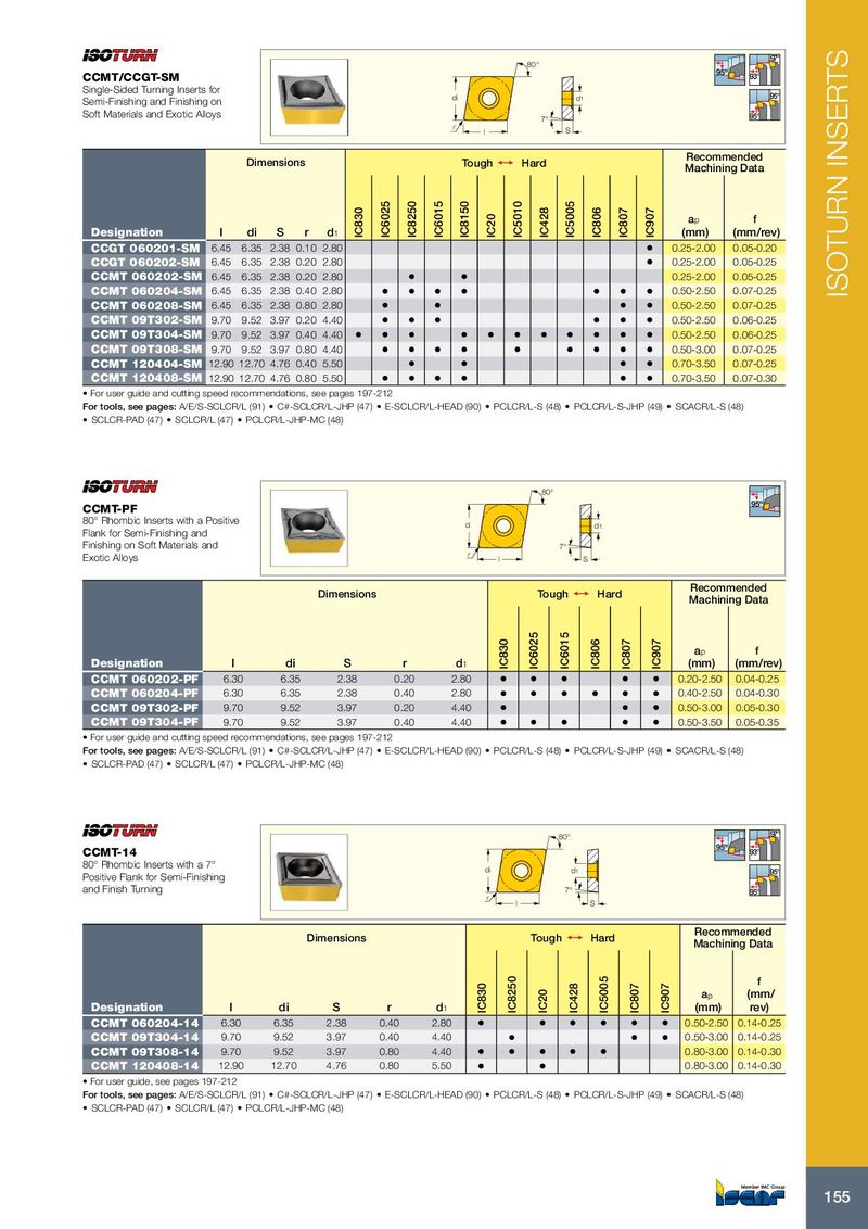 97° 80° 95º CCMT/CCGT-SM 93° Single-Sided Turning Inserts for di d 1 95° Semi-Finishing and Finishing on Soft Materials and Exotic Alloys 7° 95° r l S Recommended Dimensions Tough 1 Hard Machining Data a p f Designation l di S r d 1 IC830 IC6025 IC8250 IC6015 IC8150 IC20 IC5010 IC428 IC5005 IC806 IC807 IC907 (mm) (mm/rev) CCGT 060201-SM 6.45 6.35 2.38 0.10 2.80 • 0.25-2.00 0.05-0.20 CCGT 060202-SM 6.45 6.35 2.38 0.20 2.80 • 0.25-2.00 0.05-0.25 CCMT 060202-SM 6.45 6.35 2.38 0.20 2.80 • • 0.25-2.00 0.05-0.25 CCMT 060204-SM 6.45 6.35 2.38 0.40 2.80 • • • • • • • 0.50-2.50 0.07-0.25 ISOTURN INSERTS CCMT 060208-SM 6.45 6.35 2.38 0.80 2.80 • • • • 0.50-2.50 0.07-0.25 CCMT 09T302-SM 9.70 9.52 3.97 0.20 4.40 • • • • • • 0.50-2.50 0.06-0.25 CCMT 09T304-SM 9.70 9.52 3.97 0.40 4.40 • • • • • • • • • • • 0.50-2.50 0.06-0.25 CCMT 09T308-SM 9.70 9.52 3.97 0.80 4.40 • • • • • • • • • 0.50-3.00 0.07-0.25 CCMT 120404-SM 12.90 12.70 4.76 0.40 5.50 • • • • 0.70-3.50 0.07-0.25 CCMT 120408-SM 12.90 12.70 4.76 0.80 5.50 • • • • • • 0.70-3.50 0.07-0.30 • For user guide and cutting speed recommendations, see pages 197-212 For tools, see pages: A/E/S-SCLCR/L (91) • C#-SCLCR/L-JHP (47) • E-SCLCR/L-HEAD (90) • PCLCR/L-S (48) • PCLCR/L-S-JHP (49) • SCACR/L-S (48) • SCLCR-PAD (47) • SCLCR/L (47) • PCLCR/L-JHP-MC (48) 80° 95º CCMT-PF 80° Rhombic Inserts with a Positive d d 1 Flank for Semi-Finishing and Finishing on Soft Materials and 7° Exotic Alloys r l S Recommended Dimensions Tough 1 Hard Machining Data a p f Designation l di S r d 1 IC830 IC6025 IC6015 IC806 IC807 IC907 (mm) (mm/rev) CCMT 060202-PF 6.30 6.35 2.38 0.20 2.80 • • • • • 0.20-2.50 0.04-0.25 CCMT 060204-PF 6.30 6.35 2.38 0.40 2.80 • • • • • • 0.40-2.50 0.04-0.30 CCMT 09T302-PF 9.70 9.52 3.97 0.20 4.40 • • • 0.50-3.00 0.05-0.30 CCMT 09T304-PF 9.70 9.52 3.97 0.40 4.40 • • • • • 0.50-3.50 0.05-0.35 • For user guide and cutting speed recommendations, see pages 197-212 For tools, see pages: A/E/S-SCLCR/L (91) • C#-SCLCR/L-JHP (47) • E-SCLCR/L-HEAD (90) • PCLCR/L-S (48) • PCLCR/L-S-JHP (49) • SCACR/L-S (48) • SCLCR-PAD (47) • SCLCR/L (47) • PCLCR/L-JHP-MC (48) 80° 97° 95º CCMT-14 93° 80° Rhombic Inserts with a 7° di d 1 95° Positive Flank for Semi-Finishing and Finish Turning 7° 95° r l S Recommended Dimensions Tough 1 Hard Machining Data f a p (mm/ Designation l di S r d 1 IC830 IC8250 IC20 IC428 IC5005 IC807 IC907 (mm) rev) CCMT 060204-14 6.30 6.35 2.38 0.40 2.80 • • • • • • 0.50-2.50 0.14-0.25 CCMT 09T304-14 9.70 9.52 3.97 0.40 4.40 • • • 0.50-3.00 0.14-0.25 CCMT 09T308-14 9.70 9.52 3.97 0.80 4.40 • • • • • 0.80-3.00 0.14-0.30 CCMT 120408-14 12.90 12.70 4.76 0.80 5.50 • • 0.80-3.00 0.14-0.30 • For user guide, see pages 197-212 For tools, see pages: A/E/S-SCLCR/L (91) • C#-SCLCR/L-JHP (47) • E-SCLCR/L-HEAD (90) • PCLCR/L-S (48) • PCLCR/L-S-JHP (49) • SCACR/L-S (48) • SCLCR-PAD (47) • SCLCR/L (47) • PCLCR/L-JHP-MC (48) 155