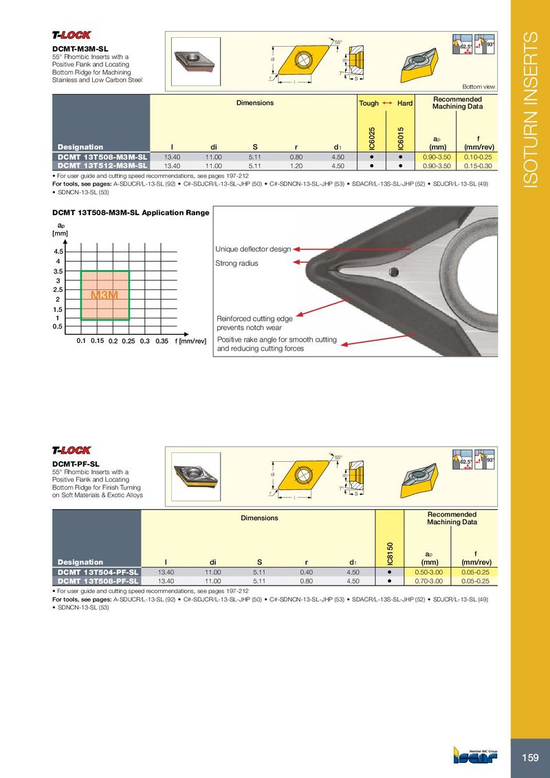 55° 62.5° 93° DCMT-M3M-SL 55° Rhombic Inserts with a di d1 Positive Flank and Locating Bottom Ridge for Machining 7° r Stainless and Low Carbon Steel S l Bottom view Recommended Dimensions Tough 1 Hard Machining Data a p f Designation l di S r d 1 IC6025 IC6015 (mm) (mm/rev) DCMT 13T508-M3M-SL 13.40 11.00 5.11 0.80 4.50 • • 0.90-3.50 0.10-0.25 DCMT 13T512-M3M-SL 13.40 11.00 5.11 1.20 4.50 • • 0.90-3.50 0.15-0.30 • For user guide and cutting speed recommendations, see pages 197-212 For tools, see pages: A-SDUCR/L-13-SL (92) • C#-SDJCR/L-13-SL-JHP (50) • C#-SDNCN-13-SL-JHP (53) • SDACR/L-13S-SL-JHP (52) • SDJCR/L-13-SL (49) ISOTURN INSERTS • SDNCN-13-SL (53) DCMT 13T508-M3M-SL Application Range ap [mm] 4.5 Unique deflector design 4 Strong radius 3.5 3 2.5 2 M3M 1.5 1 Reinforced cutting edge 0.5 prevents notch wear 0.1 0.15 0.2 0.25 0.3 0.35 f [mm/rev] Positive rake angle for smooth cutting and reducing cutting forces 55° 62.5° 93° DCMT-PF-SL 55° Rhombic Inserts with a di d1 Positive Flank and Locating Bottom Ridge for Finish Turning 7° r on Soft Materials & Exotic Alloys S l Recommended Dimensions Machining Data a p f Designation l di S r d 1 IC8150 (mm) (mm/rev) DCMT 13T504-PF-SL 13.40 11.00 5.11 0.40 4.50 • 0.50-3.00 0.05-0.25 DCMT 13T508-PF-SL 13.40 11.00 5.11 0.80 4.50 • 0.70-3.00 0.05-0.25 • For user guide and cutting speed recommendations, see pages 197-212 For tools, see pages: A-SDUCR/L-13-SL (92) • C#-SDJCR/L-13-SL-JHP (50) • C#-SDNCN-13-SL-JHP (53) • SDACR/L-13S-SL-JHP (52) • SDJCR/L-13-SL (49) • SDNCN-13-SL (53) 159