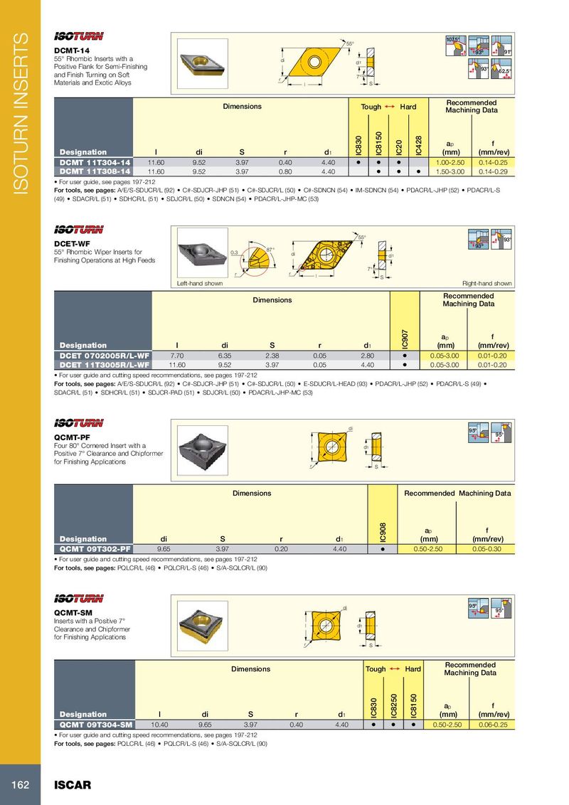 107.5° 55° DCMT-14 93º 91° 55° Rhombic Inserts with a di d 1 Positive Flank for Semi-Finishing 93° 62.5° and Finish Turning on Soft r 7° Materials and Exotic Alloys l S Recommended Dimensions Tough 1 Hard Machining Data a p f Designation l di S r d 1 IC830 IC8150 IC20 IC428 (mm) (mm/rev) DCMT 11T304-14 11.60 9.52 3.97 0.40 4.40 • • • 1.00-2.50 0.14-0.25 DCMT 11T308-14 11.60 9.52 3.97 0.80 4.40 • • • 1.50-3.00 0.14-0.29 • For user guide, see pages 197-212 ISOTURN INSERTS For tools, see pages: A/E/S-SDUCR/L (92) • C#-SDJCR-JHP (51) • C#-SDJCR/L (50) • C#-SDNCN (54) • IM-SDNCN (54) • PDACR/L-JHP (52) • PDACR/L-S (49) • SDACR/L (51) • SDHCR/L (51) • SDJCR/L (50) • SDNCN (54) • PDACR/L-JHP-MC (53) 55° 93° DCET-WF 93º 55° Rhombic Wiper Inserts for 0.3 87° di d 1 Finishing Operations at High Feeds 7° r r l S Left-hand shown Right-hand shown Recommended Dimensions Machining Data a p f Designation l di S r d 1 IC907 (mm) (mm/rev) DCET 0702005R/L-WF 7.70 6.35 2.38 0.05 2.80 • 0.05-3.00 0.01-0.20 DCET 11T3005R/L-WF 11.60 9.52 3.97 0.05 4.40 • 0.05-3.00 0.01-0.20 • For user guide and cutting speed recommendations, see pages 197-212 For tools, see pages: A/E/S-SDUCR/L (92) • C#-SDJCR-JHP (51) • C#-SDJCR/L (50) • E-SDUCR/L-HEAD (93) • PDACR/L-JHP (52) • PDACR/L-S (49) • SDACR/L (51) • SDHCR/L (51) • SDJCR-PAD (51) • SDJCR/L (50) • PDACR/L-JHP-MC (53) di 95º 95° QCMT-PF Four 80° Cornered Insert with a l d 1 Positive 7° Clearance and Chipformer for Finishing Applications r S Dimensions Recommended Machining Data a p f Designation di S r d 1 IC908 (mm) (mm/rev) QCMT 09T302-PF 9.65 3.97 0.20 4.40 • 0.50-2.50 0.05-0.30 • For user guide and cutting speed recommendations, see pages 197-212 For tools, see pages: PQLCR/L (46) • PQLCR/L-S (46) • S/A-SQLCR/L (90) di 95º 95° QCMT-SM Inserts with a Positive 7° l d 1 Clearance and Chipformer for Finishing Applications r S Recommended Dimensions Tough 1 Hard Machining Data a p f Designation l di S r d 1 IC830 IC8250 IC8150 (mm) (mm/rev) QCMT 09T304-SM 10.40 9.65 3.97 0.40 4.40 • • • 0.50-2.50 0.06-0.25 • For user guide and cutting speed recommendations, see pages 197-212 For tools, see pages: PQLCR/L (46) • PQLCR/L-S (46) • S/A-SQLCR/L (90) 162 ISCAR