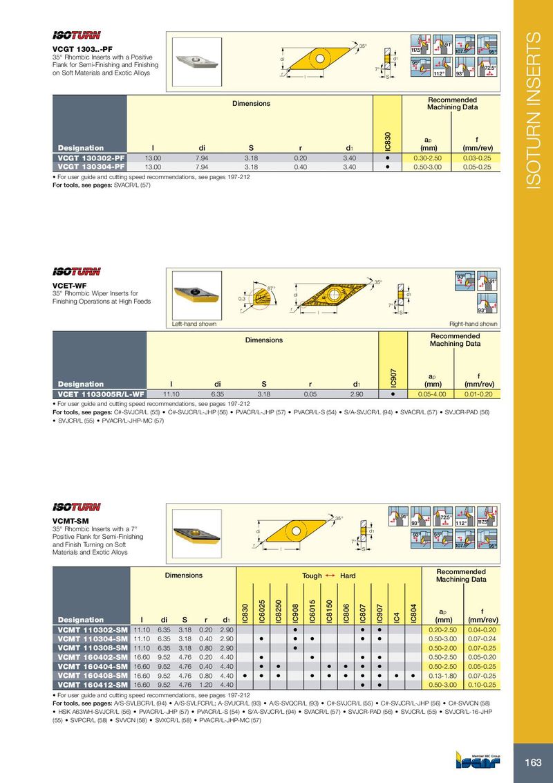 35° 91° VCGT 1303..-PF 117.5° 107.5º 95º 35° Rhombic Inserts with a Positive di d 1 Flank for Semi-Finishing and Finishing 95º 7° 72.5° on Soft Materials and Exotic Alloys r 112° 93° l S Recommended Dimensions Machining Data a p f Designation l di S r d 1 IC830 (mm) (mm/rev) VCGT 130302-PF 13.00 7.94 3.18 0.20 3.40 • 0.30-2.50 0.03-0.25 VCGT 130304-PF 13.00 7.94 3.18 0.40 3.40 • 0.50-3.00 0.05-0.25 • For user guide and cutting speed recommendations, see pages 197-212 For tools, see pages: SVACR/L (57) ISOTURN INSERTS 93º 35° 91° VCET-WF 87° WF 35° Rhombic Wiper Inserts for di 0.3 R d 1 Finishing Operations at High Feeds 7° r r l S 93° Left-hand shown Right-hand shown Recommended Dimensions Machining Data a p f Designation l di S r d 1 IC907 (mm) (mm/rev) VCET 1103005R/L-WF 11.10 6.35 3.18 0.05 2.90 • 0.05-4.00 0.01-0.20 • For user guide and cutting speed recommendations, see pages 197-212 For tools, see pages: C#-SVJCR/L (55) • C#-SVJCR/L-JHP (56) • PVACR/L-JHP (57) • PVACR/L-S (54) • S/A-SVJCR/L (94) • SVACR/L (57) • SVJCR-PAD (56) • SVJCR/L (55) • PVACR/L-JHP-MC (57) 35° 91° 72.5° VCMT-SM 93° 112° 117.5° 35° Rhombic Inserts with a 7° di d 1 Positive Flank for Semi-Finishing 93º 95º 7° and Finish Turning on Soft r 107.5º 95º l S Materials and Exotic Alloys Recommended Dimensions Tough 1 Hard Machining Data a p f Designation l di S r d 1 IC830 IC6025 IC8250 IC908 IC6015 IC8150 IC806 IC807 IC907 IC4 IC804 (mm) (mm/rev) VCMT 110302-SM 11.10 6.35 3.18 0.20 2.90 • • • 0.20-2.50 0.04-0.20 VCMT 110304-SM 11.10 6.35 3.18 0.40 2.90 • • • • • 0.50-3.00 0.07-0.24 VCMT 110308-SM 11.10 6.35 3.18 0.80 2.90 • 0.50-2.00 0.07-0.25 VCMT 160402-SM 16.60 9.52 4.76 0.20 4.40 • • • • 0.50-2.50 0.05-0.20 VCMT 160404-SM 16.60 9.52 4.76 0.40 4.40 • • • • • • 0.50-2.50 0.05-0.25 VCMT 160408-SM 16.60 9.52 4.76 0.80 4.40 • • • • • • • • • • 0.13-1.80 0.07-0.25 VCMT 160412-SM 16.60 9.52 4.76 1.20 4.40 • • 0.50-3.00 0.10-0.25 • For user guide and cutting speed recommendations, see pages 197-212 For tools, see pages: A/S-SVLBCR/L (94) • A/S-SVLFCR/L; A-SVUCR/L (93) • A/S-SVQCR/L (93) • C#-SVJCR/L (55) • C#-SVJCR/L-JHP (56) • C#-SVVCN (58) • HSK A63WH-SVJCR/L (56) • PVACR/L-JHP (57) • PVACR/L-S (54) • S/A-SVJCR/L (94) • SVACR/L (57) • SVJCR-PAD (56) • SVJCR/L (55) • SVJCR/L-16-JHP (55) • SVPCR/L (58) • SVVCN (58) • SVXCR/L (58) • PVACR/L-JHP-MC (57) 163