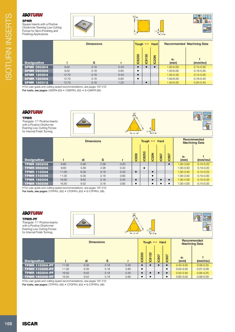 90° 45° 45° 45° SPMR Square Inserts with a Positive l Chipformer Exerting Low Cutting Forces for Semi-Finishing and 11° 75º Finishing Applications r S Dimensions Tough 1 Hard Recommended Machining Data a p f Designation l S r IC8250 IC8150 IC20N (mm) (mm/rev) SPMR 090304 9.52 3.18 0.40 • • • 1.50-5.00 0.15-0.30 SPMR 090308 9.52 3.18 0.80 • 1.50-6.00 0.16-0.35 SPMR 120304 12.70 3.18 0.40 • 1.50-5.00 0.15-0.35 ISOTURN INSERTS SPMR 120308 12.70 3.18 0.80 • 1.50-6.00 0.16-0.40 SPMR 120312 12.70 3.18 1.20 • 1.50-6.00 0.20-0.45 • For user guide and cutting speed recommendations, see pages 197-212 For tools, see pages: CSDPN (63) • CSSPR/L (62) • S-CSKPR (96) 60° 91º 91° TPMR Triangular 11° Positive Inserts l 91° with a Positive Chipformer Exerting Low Cutting Forces for Internal Finish Turning r 11° d S Recommended Dimensions Tough 1 Hard Machining Data a p f Designation l di S r IC830 IC8250 IC20N IC807 IC907 (mm) (mm/rev) TPMR 090202 9.60 5.56 2.38 0.20 • 1.00-3.00 0.10-0.20 TPMR 090204 9.60 5.56 2.38 0.40 • 1.00-3.50 0.15-0.20 TPMR 110304 11.00 6.35 3.18 0.40 • • 1.00-3.50 0.15-0.25 TPMR 110308 11.00 6.35 3.18 0.80 • 1.00-3.50 0.15-0.30 TPMR 160304 16.50 9.52 3.18 0.40 • • • • 1.00-4.00 0.15-0.33 TPMR 160308 16.50 9.52 3.18 0.80 • • • • 1.00-4.00 0.15-0.35 • For user guide and cutting speed recommendations, see pages 197-212 For tools, see pages: CTFPR/L (63) • CTGPR/L (63) • S-CTFPR/L (96) 60° 91º 91° TPMR-PF Triangular 11° Positive Inserts l 91° with a Positive Chipformer Exerting Low Cutting Forces 11° for Internal Finish Turning r di S Recommended Dimensions Tough 1 Hard Machining Data a p f Designation l di S r IC8250 IC8150 IC807 IC907 (mm) (mm/rev) TPMR 110304-PF 11.00 6.35 3.18 0.40 • • • • 0.40-3.00 0.08-0.25 TPMR 110308-PF 11.00 6.35 3.18 0.80 • • 0.50-3.50 0.07-0.28 TPMR 160304-PF 16.50 9.52 3.18 0.40 • • • • 0.50-3.50 0.06-0.25 TPMR 160308-PF 16.50 9.52 3.18 0.80 • • • 0.80-3.00 0.08-0.28 • For user guide and cutting speed recommendations, see pages 197-212 For tools, see pages: CTFPR/L (63) • CTGPR/L (63) • S-CTFPR/L (96) 168 ISCAR