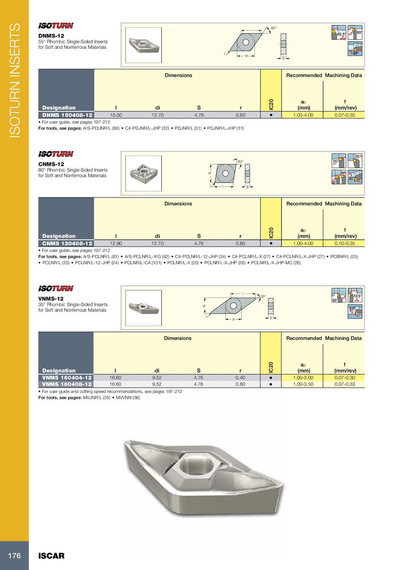 55° l 62.5° 93° DNMS-12 55° Rhombic Single-Sided Inserts for Soft and Nonferrous Materials r 93º di S Dimensions Recommended Machining Data a p f Designation l di S r IC20 (mm) (mm/rev) DNMS 150408-12 15.50 12.70 4.76 0.80 • 1.00-4.00 0.07-0.35 • For user guide, see pages 197-212 For tools, see pages: A/S-PDUNR/L (86) • C#-PDJNR/L-JHP (32) • PDJNR/L (31) • PDJNR/L-JHP (31) ISOTURN INSERTS 75° 80° 75° CNMS-12 80° Rhombic Single-Sided Inserts di 95° for Soft and Nonferrous Materials 95º 95° r l S Dimensions Recommended Machining Data a p f Designation l di S r IC20 (mm) (mm/rev) CNMS 120408-12 12.90 12.70 4.76 0.80 • 1.00-4.00 0.10-0.35 • For user guide, see pages 197-212 For tools, see pages: A/S-PCLNR/L (81) • A/S-PCLNR/L-X/G (82) • C#-PCLNR/L-12-JHP (24) • C#-PCLNR/L-X (27) • C#-PCLNR/L-X-JHP (27) • PCBNR/L (25) • PCLNR/L (23) • PCLNR/L-12-JHP (24) • PCLNR/L-CA (101) • PCLNR/L-X (25) • PCLNR/L-X-JHP (26) • PCLNR/L-X-JHP-MC (26) l 35° 72.5° VNMS-12 93° 35° Rhombic Single-Sided Inserts di for Soft and Nonferrous Materials 93º r d S Dimensions Recommended Machining Data a p f Designation l di S r IC20 (mm) (mm/rev) VNMS 160404-12 16.60 9.52 4.76 0.40 • 1.00-3.00 0.07-0.30 VNMS 160408-12 16.60 9.52 4.76 0.80 • 1.00-3.50 0.07-0.33 • For user guide and cutting speed recommendations, see pages 197-212 For tools, see pages: MVJNR/L (35) • MVVNN (36) 176 ISCAR