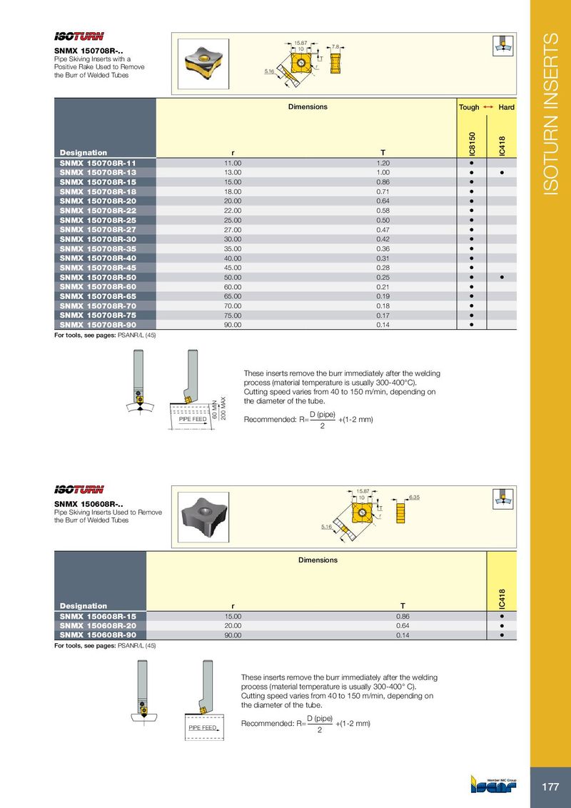 15.87 10 7.8 SNMX 150708R-.. Pipe Skiving Inserts with a T Positive Rake Used to Remove r 5.16 the Burr of Welded Tubes Dimensions Tough 1 Hard Designation r T IC8150 IC418 SNMX 150708R-11 11.00 1.20 • SNMX 150708R-13 13.00 1.00 • • SNMX 150708R-15 15.00 0.86 • SNMX 150708R-18 18.00 0.71 • ISOTURN INSERTS SNMX 150708R-20 20.00 0.64 • SNMX 150708R-22 22.00 0.58 • SNMX 150708R-25 25.00 0.50 • SNMX 150708R-27 27.00 0.47 • SNMX 150708R-30 30.00 0.42 • SNMX 150708R-35 35.00 0.36 • SNMX 150708R-40 40.00 0.31 • SNMX 150708R-45 45.00 0.28 • SNMX 150708R-50 50.00 0.25 • • SNMX 150708R-60 60.00 0.21 • SNMX 150708R-65 65.00 0.19 • SNMX 150708R-70 70.00 0.18 • SNMX 150708R-75 75.00 0.17 • SNMX 150708R-90 90.00 0.14 • For tools, see pages: PSANR/L (45) These inserts remove the burr immediately after the welding process (material temperature is usually 300-400°C). Cutting speed varies from 40 to 150 m/min, depending on the diameter of the tube. D (pipe) PIPE FEED 60 MIN 200 MAX Recommended: R= +(1-2 mm) 2 15.87 10 6.35 SNMX 150608R-.. T Pipe Skiving Inserts Used to Remove r the Burr of Welded Tubes 5.16 Dimensions Designation r T IC418 SNMX 150608R-15 15.00 0.86 • SNMX 150608R-20 20.00 0.64 • SNMX 150608R-90 90.00 0.14 • For tools, see pages: PSANR/L (45) These inserts remove the burr immediately after the welding process (material temperature is usually 300-400° C). Cutting speed varies from 40 to 150 m/min, depending on the diameter of the tube. D (pipe) Recommended: R= +(1-2 mm) PIPE FEED 2 177